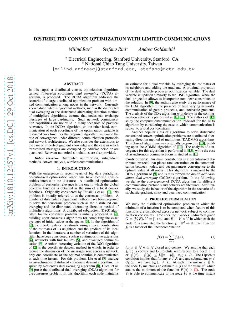 In this paper, a distributed convex optimization algorithm, termed \emph{distributed coordinate dual averaging} (DCDA) algorithm, is proposed. The DCDA algorithm addresses the scenario of a large distributed optimization problem with limited communication among nodes in the network. Currently known distributed subgradient methods, such as the distributed dual averaging or the distributed alternating direction method of multipliers algorithms, assume that nodes can exchange messages of large cardinality. Such network communication capabilities are not valid in many scenarios of practical relevance. In the DCDA algorithm, on the other hand, communication of each coordinate of the optimization variable is restricted over time. For the proposed algorithm, we bound the rate of convergence under different communication protocols and network architectures. We also consider the extensions to the case of imperfect gradient knowledge and the case in which transmitted messages are corrupted by additive noise or are quantized. Relevant numerical simulations are also provided.