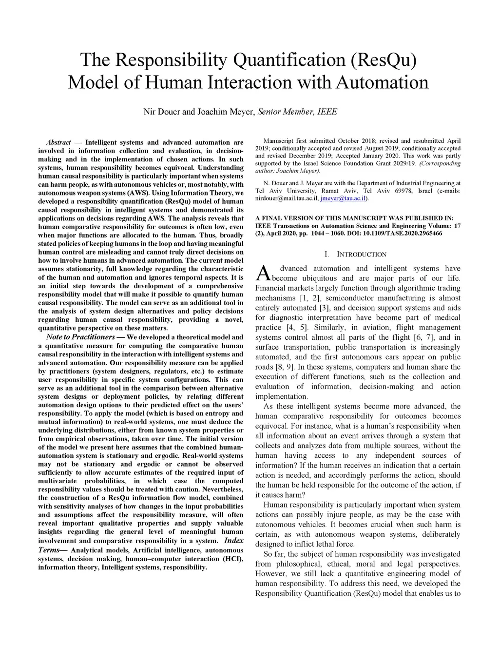 Intelligent systems and advanced automation are involved in information collection and evaluation, in decision-making and in the implementation of chosen actions. In such systems, human responsibility becomes equivocal. Understanding human responsibility is particularly important when intelligent autonomous systems can harm people, as with autonomous vehicles or, most notably, with Advanced Weapon Systems (AWS). Using Information Theory, we develop a responsibility quantification (ResQu) model of human involvement in intelligent automated systems and demonstrate its applications on decisions regarding AWS. The analysis reveals that human comparative responsibility is often low, even when major functions are allocated to the human. Thus, broadly stated policies of keeping humans in the loop and having meaningful human control are misleading and cannot truly direct decisions on how to involve humans in intelligent systems and advanced automation. Our responsibility model can guide system design decisions and can aid policy and legal decisions regarding human responsibility in intelligent systems.