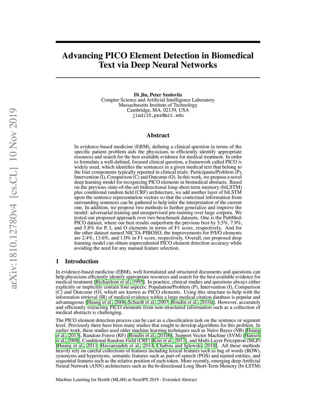 In evidence-based medicine (EBM), defining a clinical question in terms of the specific patient problem aids the physicians to efficiently identify appropriate resources and search for the best available evidence for medical treatment. In order to formulate a well-defined, focused clinical question, a framework called PICO is widely used, which identifies the sentences in a given medical text that belong to the four components typically reported in clinical trials: Participants/Problem (P), Intervention (I), Comparison (C) and Outcome (O). In this work, we propose a novel deep learning model for recognizing PICO elements in biomedical abstracts. Based on the previous state-of-the-art bidirectional long-short term memory (biLSTM) plus conditional random field (CRF) architecture, we add another layer of biLSTM upon the sentence representation vectors so that the contextual information from surrounding sentences can be gathered to help infer the interpretation of the current one. In addition, we propose two methods to further generalize and improve the model: adversarial training and unsupervised pre-training over large corpora. We tested our proposed approach over two benchmark datasets. One is the PubMed-PICO dataset, where our best results outperform the previous best by 5.5%, 7.9%, and 5.8% for P, I, and O elements in terms of F1 score, respectively. And for the other dataset named NICTA-PIBOSO, the improvements for P/I/O elements are 2.4%, 13.6%, and 1.0% in F1 score, respectively. Overall, our proposed deep learning model can obtain unprecedented PICO element detection accuracy while avoiding the need for any manual feature selection.