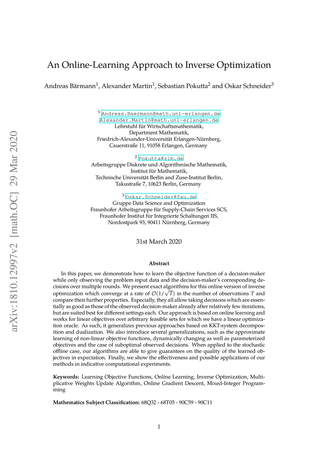 In this paper, we demonstrate how to learn the objective function of a decision-maker while only observing the problem input data and the decision-maker's corresponding decisions over multiple rounds. We present exact algorithms for this online version of inverse optimization which converge at a rate of $ \mathcal{O}(1/\sqrt{T}) $ in the number of observations~ and compare their further properties. Especially, they all allow taking decisions which are essentially as good as those of the observed decision-maker already after relatively few iterations, but are suited best for different settings each. Our approach is based on online learning and works for linear objectives over arbitrary feasible sets for which we have a linear optimization oracle. As such, it generalizes previous approaches based on KKT-system decomposition and dualization. We also introduce several generalizations, such as the approximate learning of non-linear objective functions, dynamically changing as well as parameterized objectives and the case of suboptimal observed decisions. When applied to the stochastic offline case, our algorithms are able to give guarantees on the quality of the learned objectives in expectation. Finally, we show the effectiveness and possible applications of our methods in indicative computational experiments.