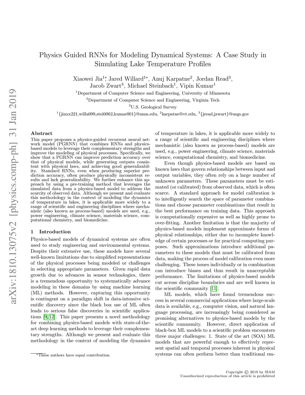 This paper proposes a physics-guided recurrent neural network model (PGRNN) that combines RNNs and physics-based models to leverage their complementary strengths and improve the modeling of physical processes. Specifically, we show that a PGRNN can improve prediction accuracy over that of physical models, while generating outputs consistent with physical laws, and achieving good generalizability. Standard RNNs, even when producing superior prediction accuracy, often produce physically inconsistent results and lack generalizability. We further enhance this approach by using a pre-training method that leverages the simulated data from a physics-based model to address the scarcity of observed data. The PGRNN has the flexibility to incorporate additional physical constraints and we incorporate a density-depth relationship. Both enhancements further improve PGRNN performance. Although we present and evaluate this methodology in the context of modeling the dynamics of temperature in lakes, it is applicable more widely to a range of scientific and engineering disciplines where mechanistic (also known as process-based) models are used, e.g., power engineering, climate science, materials science, computational chemistry, and biomedicine.