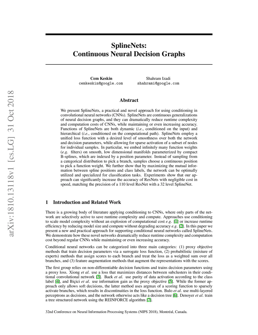 We present SplineNets, a practical and novel approach for using conditioning in convolutional neural networks (CNNs). SplineNets are continuous generalizations of neural decision graphs, and they can dramatically reduce runtime complexity and computation costs of CNNs, while maintaining or even increasing accuracy. Functions of SplineNets are both dynamic (i.e., conditioned on the input) and hierarchical (i.e., conditioned on the computational path). SplineNets employ a unified loss function with a desired level of smoothness over both the network and decision parameters, while allowing for sparse activation of a subset of nodes for individual samples. In particular, we embed infinitely many function weights (e.g. filters) on smooth, low dimensional manifolds parameterized by compact B-splines, which are indexed by a position parameter. Instead of sampling from a categorical distribution to pick a branch, samples choose a continuous position to pick a function weight. We further show that by maximizing the mutual information between spline positions and class labels, the network can be optimally utilized and specialized for classification tasks. Experiments show that our approach can significantly increase the accuracy of ResNets with negligible cost in speed, matching the precision of a 110 level ResNet with a 32 level SplineNet.