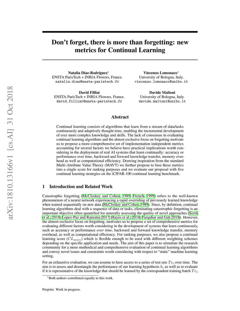 Continual learning consists of algorithms that learn from a stream of data/tasks continuously and adaptively thought time, enabling the incremental development of ever more complex knowledge and skills. The lack of consensus in evaluating continual learning algorithms and the almost exclusive focus on forgetting motivate us to propose a more comprehensive set of implementation independent metrics accounting for several factors we believe have practical implications worth considering in the deployment of real AI systems that learn continually: accuracy or performance over time, backward and forward knowledge transfer, memory overhead as well as computational efficiency. Drawing inspiration from the standard Multi-Attribute Value Theory (MAVT) we further propose to fuse these metrics into a single score for ranking purposes and we evaluate our proposal with five continual learning strategies on the iCIFAR-100 continual learning benchmark.