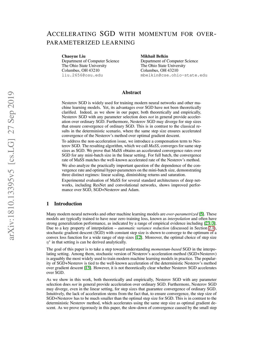 Nesterov SGD is widely used for training modern neural networks and other machine learning models. Yet, its advantages over SGD have not been theoretically clarified. Indeed, as we show in our paper, both theoretically and empirically, Nesterov SGD with any parameter selection does not in general provide acceleration over ordinary SGD. Furthermore, Nesterov SGD may diverge for step sizes that ensure convergence of ordinary SGD. This is in contrast to the classical results in the deterministic scenario, where the same step size ensures accelerated convergence of the Nesterov's method over optimal gradient descent. To address the non-acceleration issue, we introduce a compensation term to Nesterov SGD. The resulting algorithm, which we call MaSS, converges for same step sizes as SGD. We prove that MaSS obtains an accelerated convergence rates over SGD for any mini-batch size in the linear setting. For full batch, the convergence rate of MaSS matches the well-known accelerated rate of the Nesterov's method. We also analyze the practically important question of the dependence of the convergence rate and optimal hyper-parameters on the mini-batch size, demonstrating three distinct regimes: linear scaling, diminishing returns and saturation. Experimental evaluation of MaSS for several standard architectures of deep networks, including ResNet and convolutional networks, shows improved performance over SGD, Nesterov SGD and Adam.