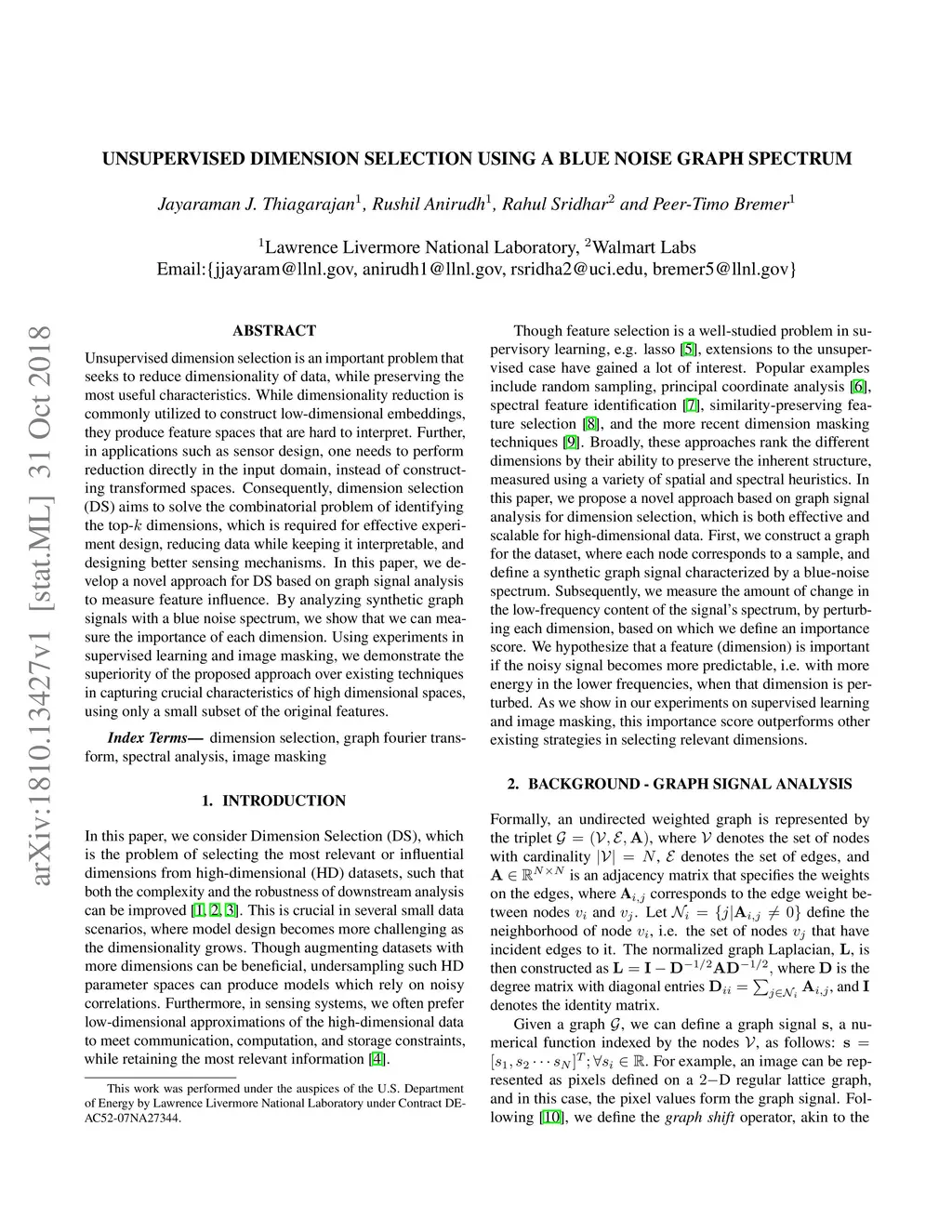 Unsupervised dimension selection is an important problem that seeks to reduce dimensionality of data, while preserving the most useful characteristics. While dimensionality reduction is commonly utilized to construct low-dimensional embeddings, they produce feature spaces that are hard to interpret. Further, in applications such as sensor design, one needs to perform reduction directly in the input domain, instead of constructing transformed spaces. Consequently, dimension selection (DS) aims to solve the combinatorial problem of identifying the top- dimensions, which is required for effective experiment design, reducing data while keeping it interpretable, and designing better sensing mechanisms. In this paper, we develop a novel approach for DS based on graph signal analysis to measure feature influence. By analyzing synthetic graph signals with a blue noise spectrum, we show that we can measure the importance of each dimension. Using experiments in supervised learning and image masking, we demonstrate the superiority of the proposed approach over existing techniques in capturing crucial characteristics of high dimensional spaces, using only a small subset of the original features.