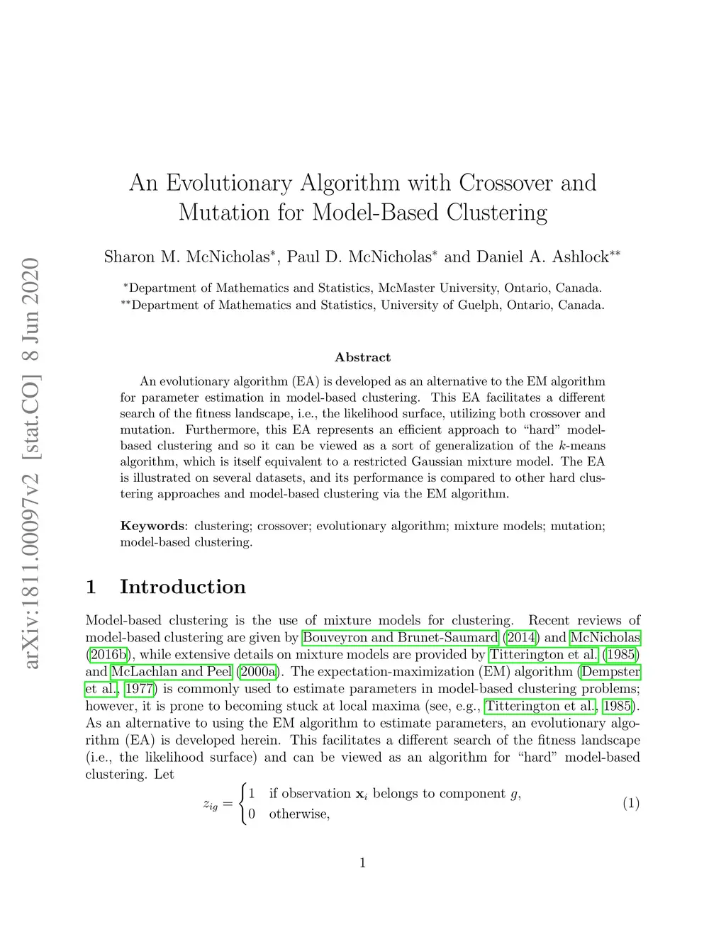 An evolutionary algorithm (EA) is developed as an alternative to the EM algorithm for parameter estimation in model-based clustering. This EA facilitates a different search of the fitness landscape, i.e., the likelihood surface, utilizing both crossover and mutation. Furthermore, this EA represents an efficient approach to "hard" model-based clustering and so it can be viewed as a sort of generalization of the k-means algorithm, which is itself equivalent to a restricted Gaussian mixture model. The EA is illustrated on several datasets, and its performance is compared to other hard clustering approaches and model-based clustering via the EM algorithm.