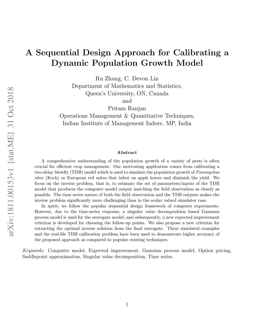 A comprehensive understanding of the population growth of a variety of pests is often crucial for efficient crop management. Our motivating application comes from calibrating a two-delay blowfly (TDB) model which is used to simulate the population growth of Panonychus ulmi (Koch) or European red mites that infest on apple leaves and diminish the yield. We focus on the inverse problem, that is, to estimate the set of parameters/inputs of the TDB model that produces the computer model output matching the field observation as closely as possible. The time series nature of both the field observation and the TDB outputs makes the inverse problem significantly more challenging than in the scalar valued simulator case. In spirit, we follow the popular sequential design framework of computer experiments. However, due to the time-series response, a singular value decomposition based Gaussian process model is used for the surrogate model, and subsequently, a new expected improvement criterion is developed for choosing the follow-up points. We also propose a new criterion for extracting the optimal inverse solution from the final surrogate. Three simulated examples and the real-life TDB calibration problem have been used to demonstrate higher accuracy of the proposed approach as compared to popular existing techniques.