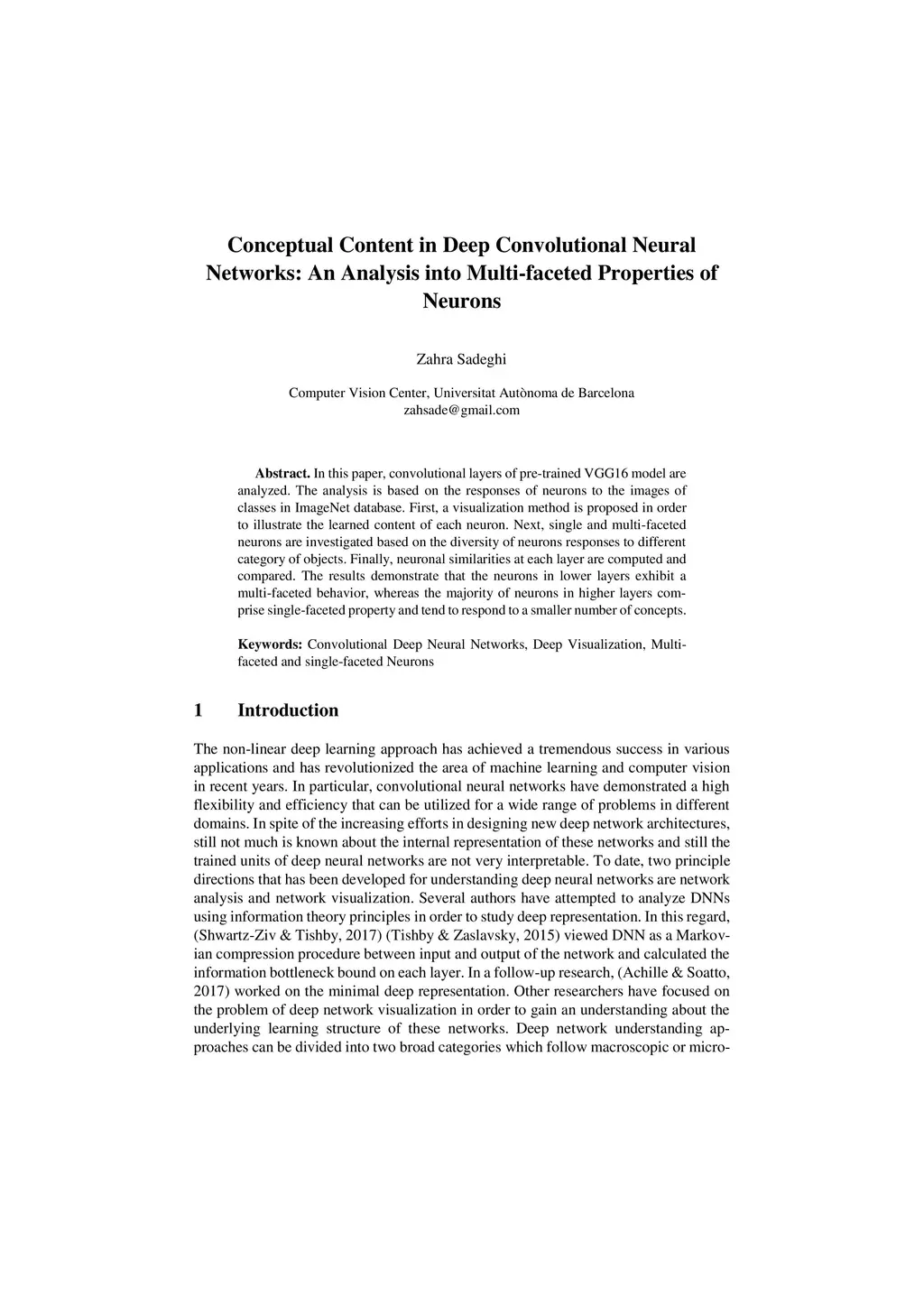In this paper, convolutional layers of pre-trained VGG16 model are analyzed. The analysis is based on the responses of neurons to the images of classes in ImageNet database. First, a visualization method is proposed in order to illustrate the learned content of each neuron. Next, single and multi-faceted neurons are investigated based on the diversity of neurons responses to different category of objects. Finally, neuronal similarities at each layer are computed and compared. The results demonstrate that the neurons in lower layers exhibit a multi-faceted behavior, whereas the majority of neurons in higher layers com-prise single-faceted property and tend to respond to a smaller number of concepts.