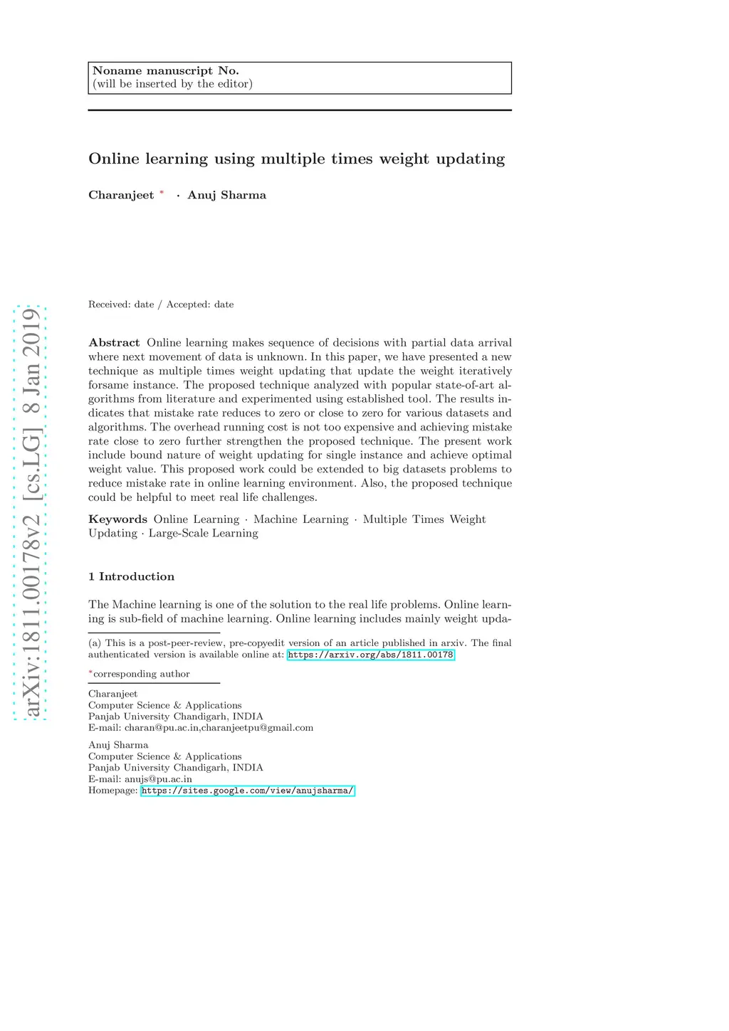 Online learning makes sequence of decisions with partial data arrival where next movement of data is unknown. In this paper, we have presented a new technique as multiple times weight updating that update the weight iteratively forsame instance. The proposed technique analyzed with popular state-of-art algorithms from literature and experimented using established tool. The results indicates that mistake rate reduces to zero or close to zero for various datasets and algorithms. The overhead running cost is not too expensive and achieving mistake rate close to zero further strengthen the proposed technique. The present work include bound nature of weight updating for single instance and achieve optimal weight value. This proposed work could be extended to big datasets problems to reduce mistake rate in online learning environment. Also, the proposed technique could be helpful to meet real life challenges.