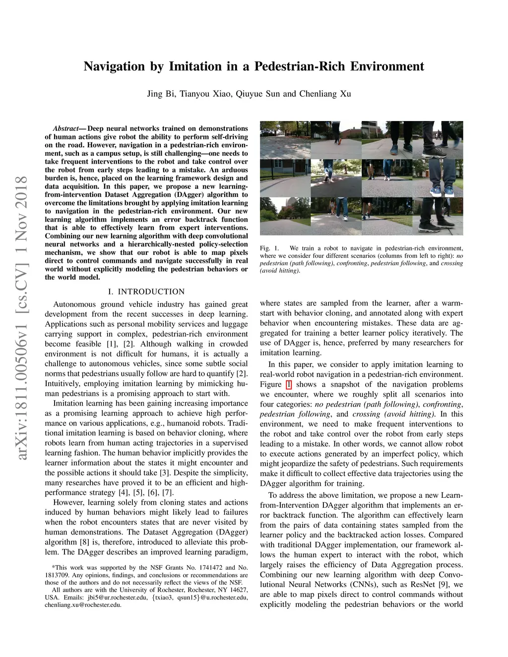 Deep neural networks trained on demonstrations of human actions give robot the ability to perform self-driving on the road. However, navigation in a pedestrian-rich environment, such as a campus setup, is still challenging---one needs to take frequent interventions to the robot and take control over the robot from early steps leading to a mistake. An arduous burden is, hence, placed on the learning framework design and data acquisition. In this paper, we propose a new learning-from-intervention Dataset Aggregation (DAgger) algorithm to overcome the limitations brought by applying imitation learning to navigation in the pedestrian-rich environment. Our new learning algorithm implements an error backtrack function that is able to effectively learn from expert interventions. Combining our new learning algorithm with deep convolutional neural networks and a hierarchically-nested policy-selection mechanism, we show that our robot is able to map pixels direct to control commands and navigate successfully in real world without explicitly modeling the pedestrian behaviors or the world model.