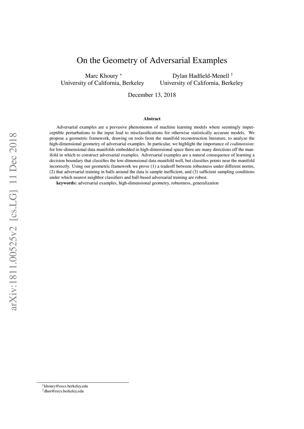 Adversarial examples are a pervasive phenomenon of machine learning models where seemingly imperceptible perturbations to the input lead to misclassifications for otherwise statistically accurate models. We propose a geometric framework, drawing on tools from the manifold reconstruction literature, to analyze the high-dimensional geometry of adversarial examples. In particular, we highlight the importance of codimension: for low-dimensional data manifolds embedded in high-dimensional space there are many directions off the manifold in which to construct adversarial examples. Adversarial examples are a natural consequence of learning a decision boundary that classifies the low-dimensional data manifold well, but classifies points near the manifold incorrectly. Using our geometric framework we prove (1) a tradeoff between robustness under different norms, (2) that adversarial training in balls around the data is sample inefficient, and (3) sufficient sampling conditions under which nearest neighbor classifiers and ball-based adversarial training are robust.