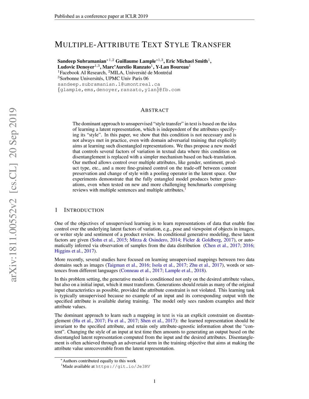 The dominant approach to unsupervised "style transfer" in text is based on the idea of learning a latent representation, which is independent of the attributes specifying its "style". In this paper, we show that this condition is not necessary and is not always met in practice, even with domain adversarial training that explicitly aims at learning such disentangled representations. We thus propose a new model that controls several factors of variation in textual data where this condition on disentanglement is replaced with a simpler mechanism based on back-translation. Our method allows control over multiple attributes, like gender, sentiment, product type, etc., and a more fine-grained control on the trade-off between content preservation and change of style with a pooling operator in the latent space. Our experiments demonstrate that the fully entangled model produces better generations, even when tested on new and more challenging benchmarks comprising reviews with multiple sentences and multiple attributes.