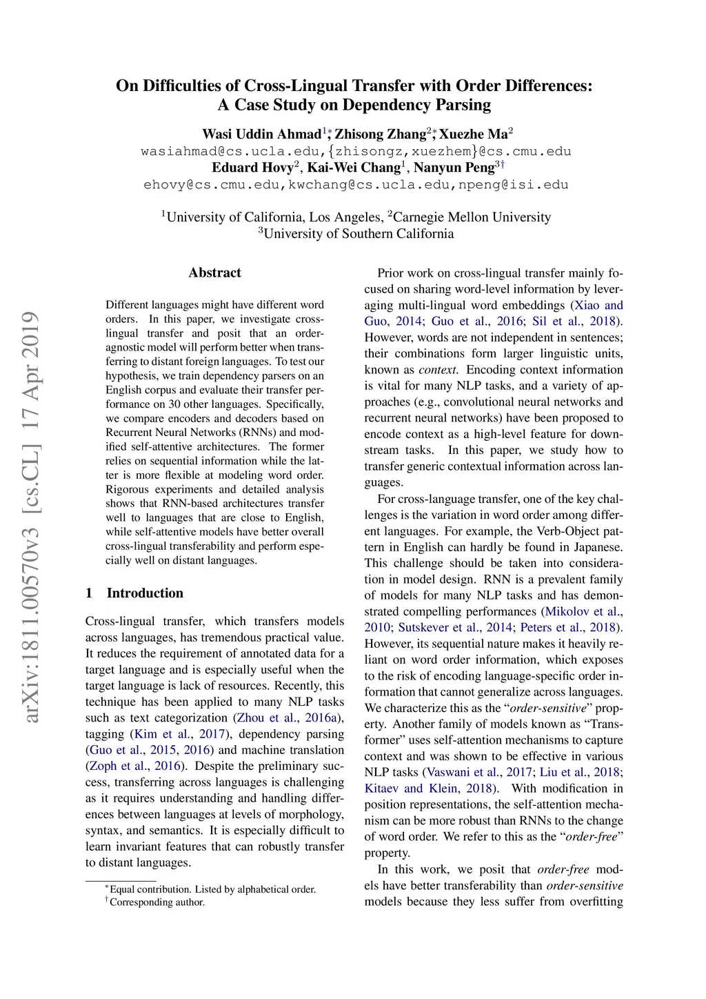 Different languages might have different word orders. In this paper, we investigate cross-lingual transfer and posit that an order-agnostic model will perform better when transferring to distant foreign languages. To test our hypothesis, we train dependency parsers on an English corpus and evaluate their transfer performance on 30 other languages. Specifically, we compare encoders and decoders based on Recurrent Neural Networks (RNNs) and modified self-attentive architectures. The former relies on sequential information while the latter is more flexible at modeling word order. Rigorous experiments and detailed analysis shows that RNN-based architectures transfer well to languages that are close to English, while self-attentive models have better overall cross-lingual transferability and perform especially well on distant languages.