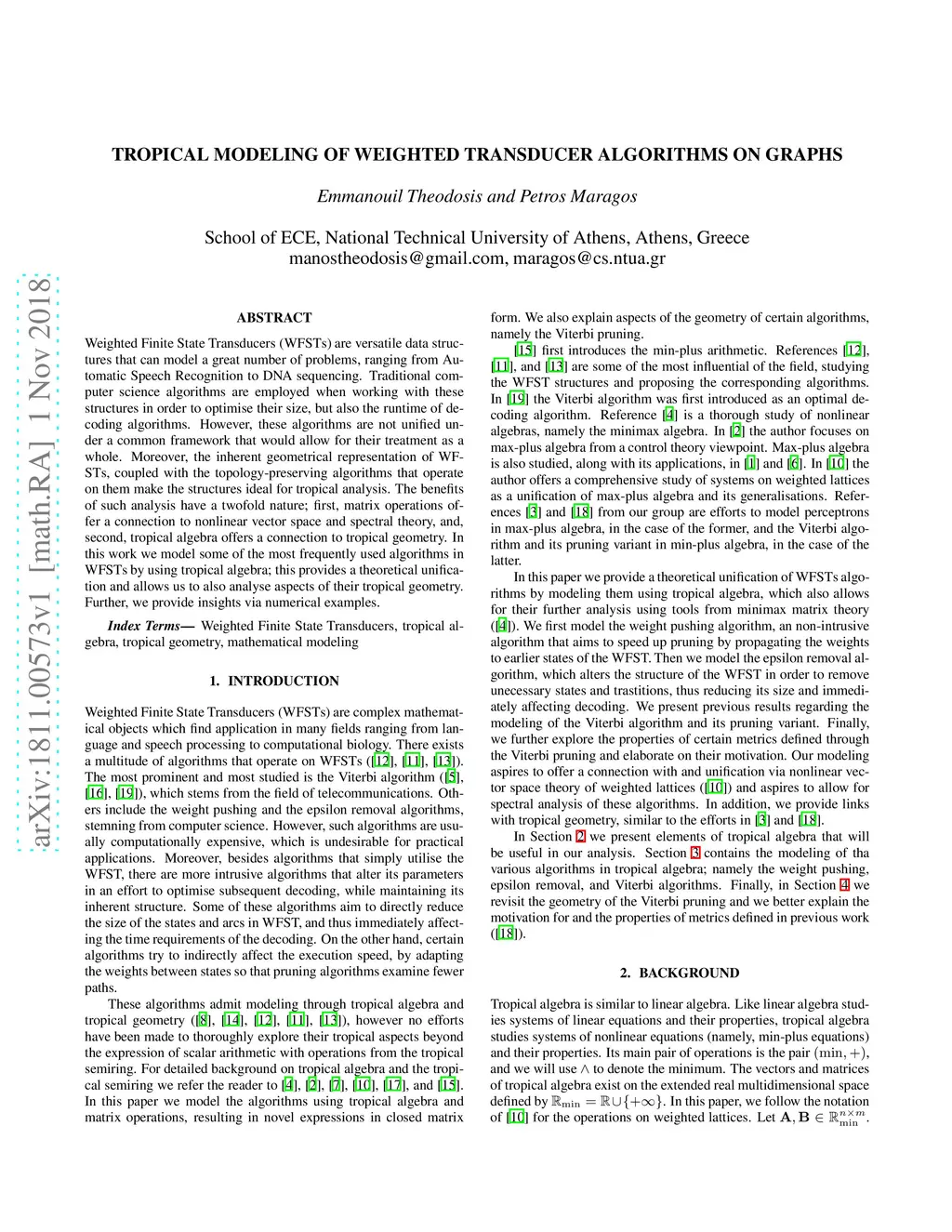 Weighted Finite State Transducers (WFSTs) are versatile data structures that can model a great number of problems, ranging from Automatic Speech Recognition to DNA sequencing. Traditional computer science algorithms are employed when working with these structures in order to optimise their size, but also the runtime of decoding algorithms. However, these algorithms are not unified under a common framework that would allow for their treatment as a whole. Moreover, the inherent geometrical representation of WFSTs, coupled with the topology-preserving algorithms that operate on them make the structures ideal for tropical analysis. The benefits of such analysis have a twofold nature; first, matrix operations offer a connection to nonlinear vector space and spectral theory, and, second, tropical algebra offers a connection to tropical geometry. In this work we model some of the most frequently used algorithms in WFSTs by using tropical algebra; this provides a theoretical unification and allows us to also analyse aspects of their tropical geometry. Further, we provide insights via numerical examples.