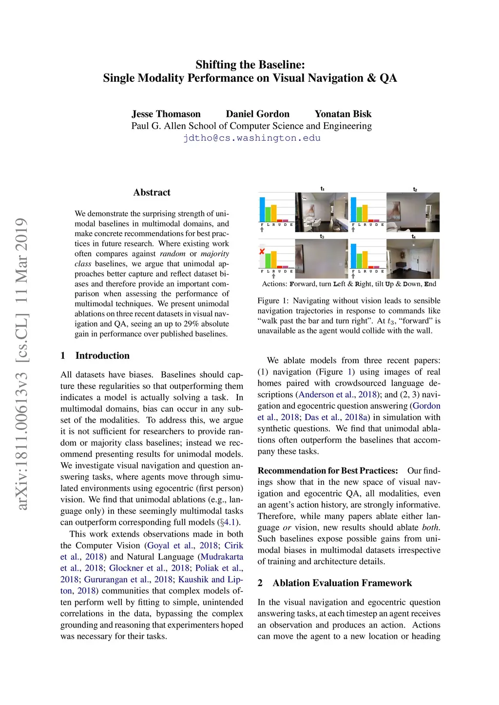 We demonstrate the surprising strength of unimodal baselines in multimodal domains, and make concrete recommendations for best practices in future research. Where existing work often compares against random or majority class baselines, we argue that unimodal approaches better capture and reflect dataset biases and therefore provide an important comparison when assessing the performance of multimodal techniques. We present unimodal ablations on three recent datasets in visual navigation and QA, seeing an up to 29% absolute gain in performance over published baselines.