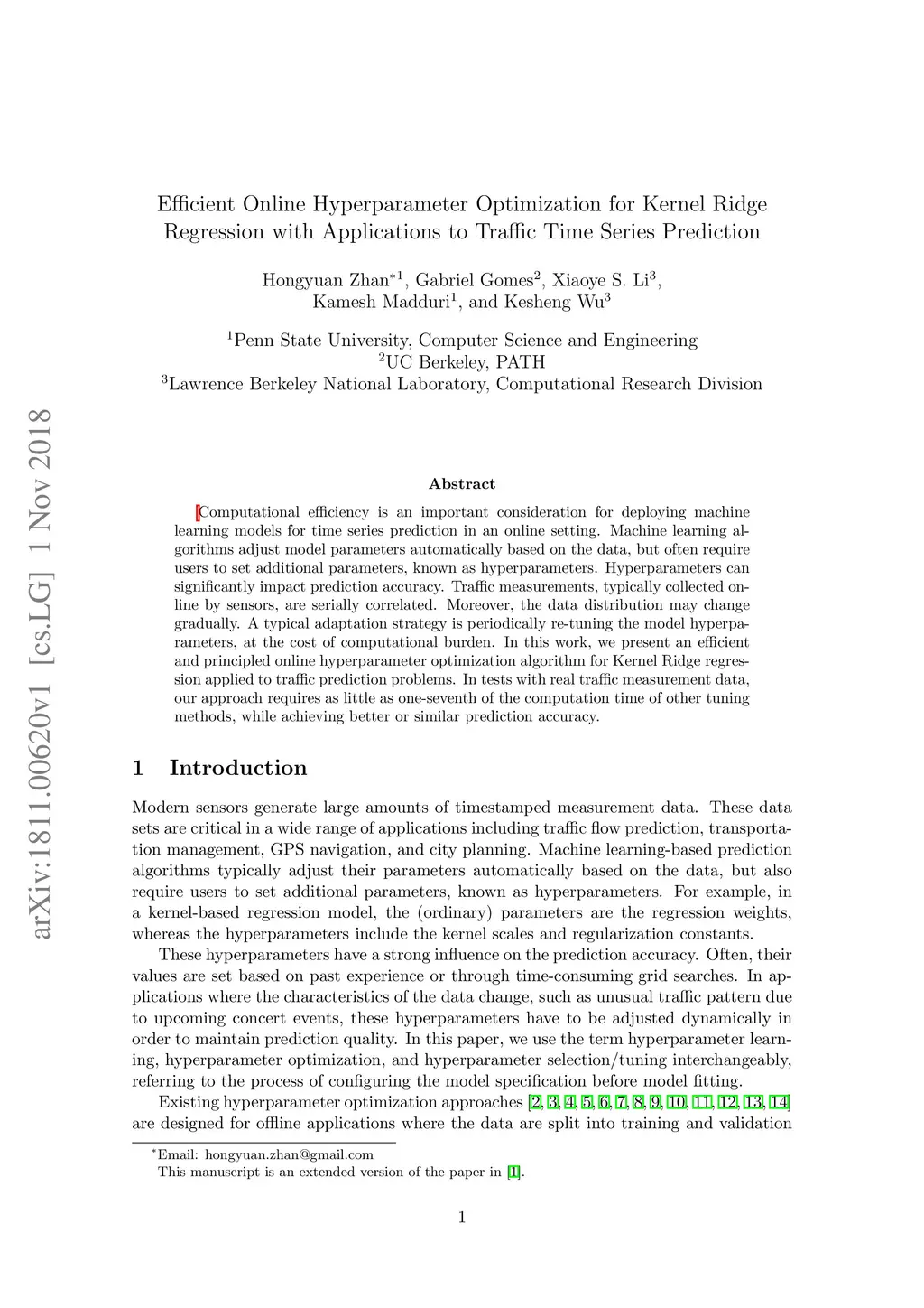 Computational efficiency is an important consideration for deploying machine learning models for time series prediction in an online setting. Machine learning algorithms adjust model parameters automatically based on the data, but often require users to set additional parameters, known as hyperparameters. Hyperparameters can significantly impact prediction accuracy. Traffic measurements, typically collected online by sensors, are serially correlated. Moreover, the data distribution may change gradually. A typical adaptation strategy is periodically re-tuning the model hyperparameters, at the cost of computational burden. In this work, we present an efficient and principled online hyperparameter optimization algorithm for Kernel Ridge regression applied to traffic prediction problems. In tests with real traffic measurement data, our approach requires as little as one-seventh of the computation time of other tuning methods, while achieving better or similar prediction accuracy.