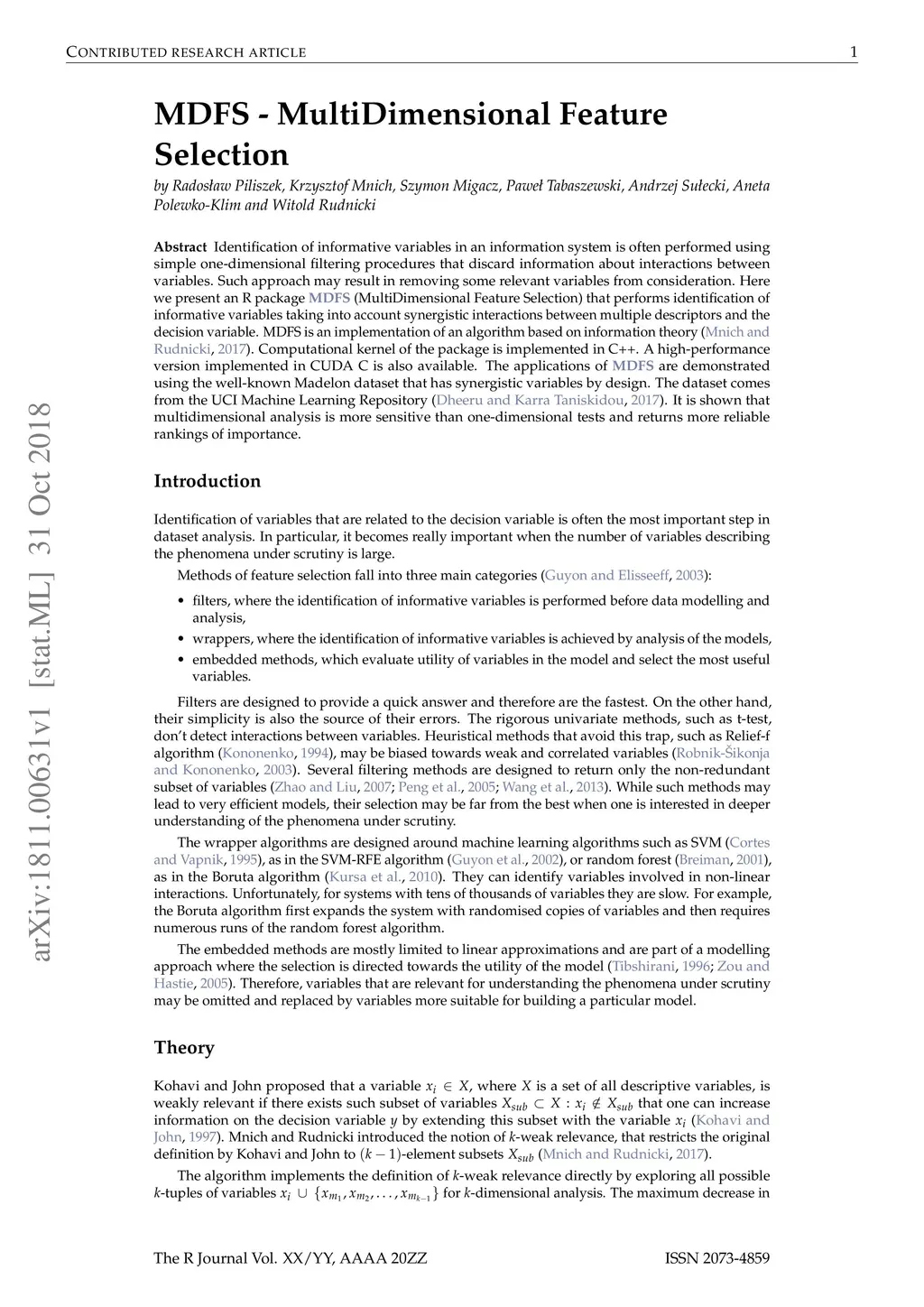 Identification of informative variables in an information system is often performed using simple one-dimensional filtering procedures that discard information about interactions between variables. Such approach may result in removing some relevant variables from consideration. Here we present an R package MDFS (MultiDimensional Feature Selection) that performs identification of informative variables taking into account synergistic interactions between multiple descriptors and the decision variable. MDFS is an implementation of an algorithm based on information theory. Computational kernel of the package is implemented in C++. A high-performance version implemented in CUDA C is also available. The applications of MDFS are demonstrated using the well-known Madelon dataset that has synergistic variables by design. The dataset comes from the UCI Machine Learning Repository. It is shown that multidimensional analysis is more sensitive than one-dimensional tests and returns more reliable rankings of importance.