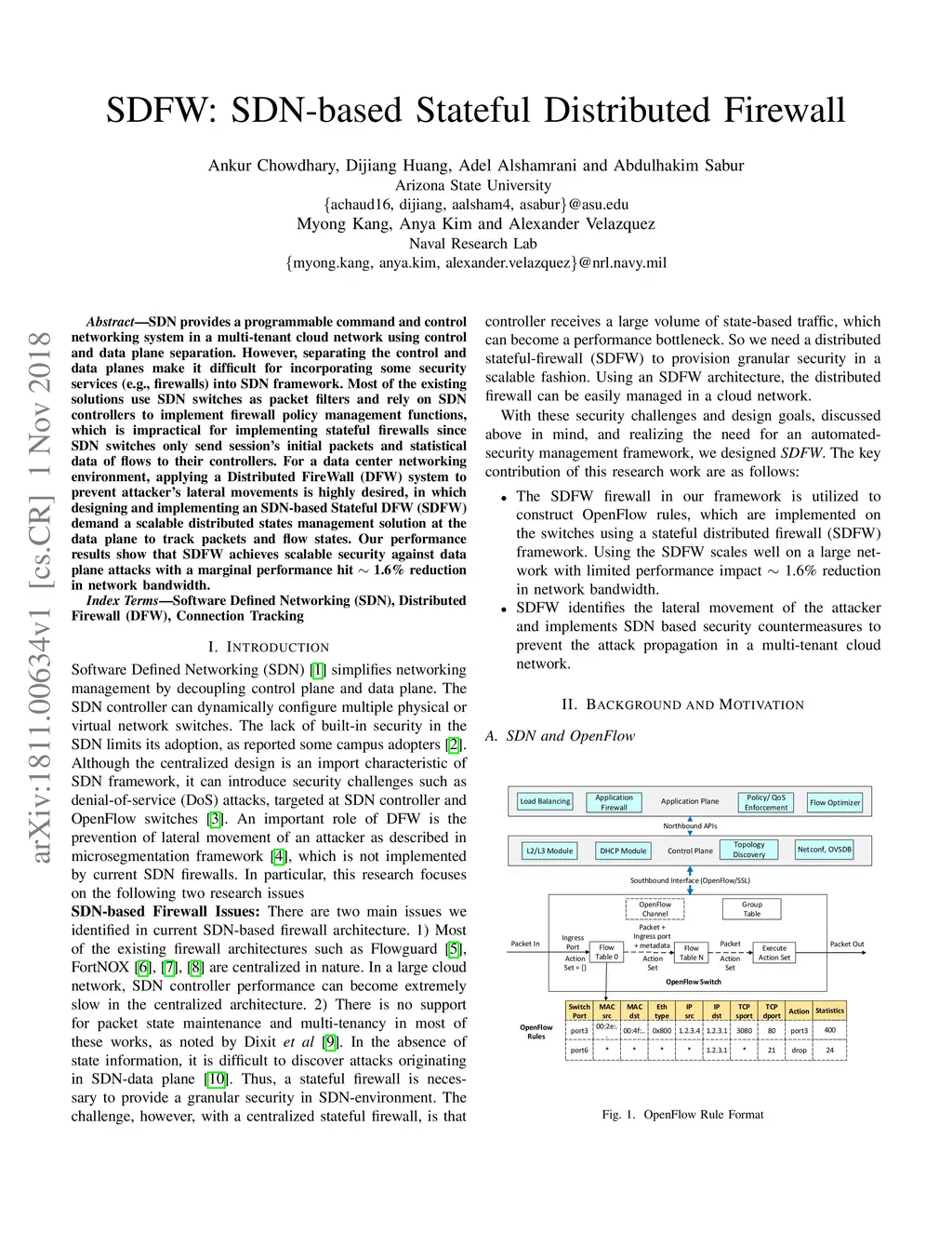 SDN provides a programmable command and control networking system in a multi-tenant cloud network using control and data plane separation. However, separating the control and data planes make it difficult for incorporating some security services (e.g., firewalls) into SDN framework. Most of the existing solutions use SDN switches as packet filters and rely on SDN controllers to implement firewall policy management functions, which is impractical for implementing stateful firewalls since SDN switches only send session's initial packets and statistical data of flows to their controllers. For a data center networking environment, applying a Distributed FireWall (DFW) system to prevent attacker's lateral movements is highly desired, in which designing and implementing an SDN-based Stateful DFW (SDFW) demand a scalable distributed states management solution at the data plane to track packets and flow states. Our performance results show that SDFW achieves scalable security against data plane attacks with a marginal performance hit ~ 1.6% reduction in network bandwidth.