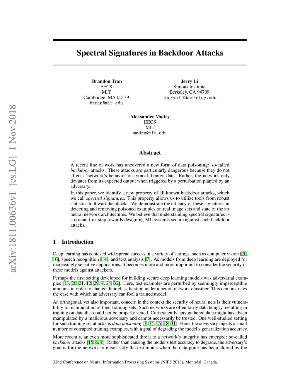A recent line of work has uncovered a new form of data poisoning: so-called \emph{backdoor} attacks. These attacks are particularly dangerous because they do not affect a network's behavior on typical, benign data. Rather, the network only deviates from its expected output when triggered by a perturbation planted by an adversary. In this paper, we identify a new property of all known backdoor attacks, which we call \emph{spectral signatures}. This property allows us to utilize tools from robust statistics to thwart the attacks. We demonstrate the efficacy of these signatures in detecting and removing poisoned examples on real image sets and state of the art neural network architectures. We believe that understanding spectral signatures is a crucial first step towards designing ML systems secure against such backdoor attacks