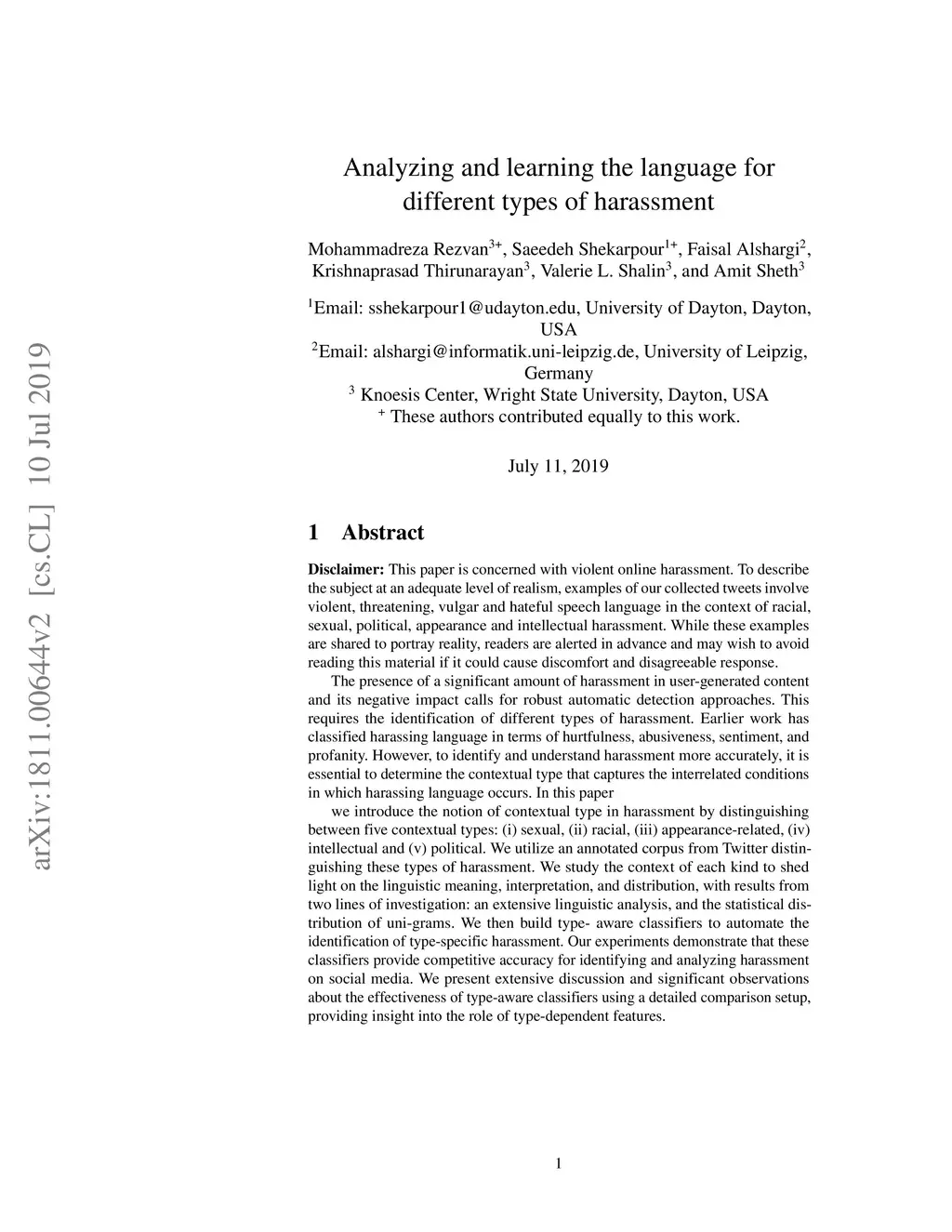 Analyzing and learning the language for different types of harassment