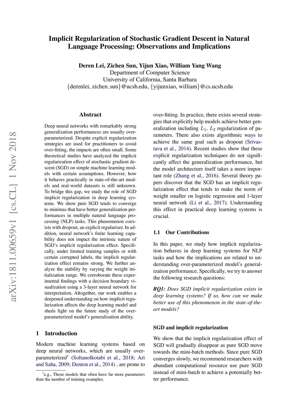 Deep neural networks with remarkably strong generalization performances are usually over-parameterized. Despite explicit regularization strategies are used for practitioners to avoid over-fitting, the impacts are often small. Some theoretical studies have analyzed the implicit regularization effect of stochastic gradient descent (SGD) on simple machine learning models with certain assumptions. However, how it behaves practically in state-of-the-art models and real-world datasets is still unknown. To bridge this gap, we study the role of SGD implicit regularization in deep learning systems. We show pure SGD tends to converge to minimas that have better generalization performances in multiple natural language processing (NLP) tasks. This phenomenon coexists with dropout, an explicit regularizer. In addition, neural network's finite learning capability does not impact the intrinsic nature of SGD's implicit regularization effect. Specifically, under limited training samples or with certain corrupted labels, the implicit regularization effect remains strong. We further analyze the stability by varying the weight initialization range. We corroborate these experimental findings with a decision boundary visualization using a 3-layer neural network for interpretation. Altogether, our work enables a deepened understanding on how implicit regularization affects the deep learning model and sheds light on the future study of the over-parameterized model's generalization ability.