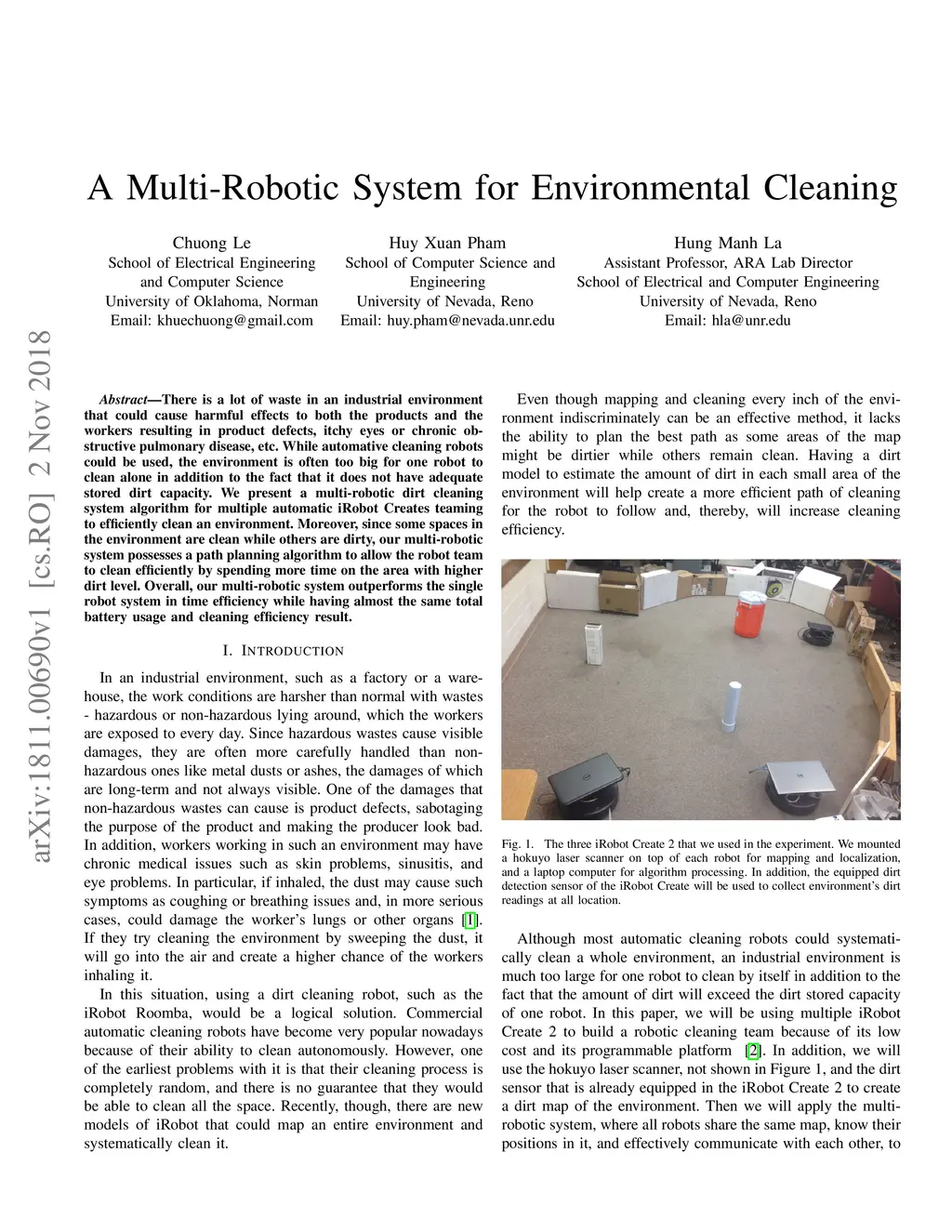 There is a lot of waste in an industrial environment that could cause harmful effects to both the products and the workers resulting in product defects, itchy eyes or chronic obstructive pulmonary disease, etc. While automative cleaning robots could be used, the environment is often too big for one robot to clean alone in addition to the fact that it does not have adequate stored dirt capacity. We present a multi-robotic dirt cleaning system algorithm for multiple automatic iRobot Creates teaming to efficiently clean an environment. Moreover, since some spaces in the environment are clean while others are dirty, our multi-robotic system possesses a path planning algorithm to allow the robot team to clean efficiently by spending more time on the area with higher dirt level. Overall, our multi-robotic system outperforms the single robot system in time efficiency while having almost the same total battery usage and cleaning efficiency result.