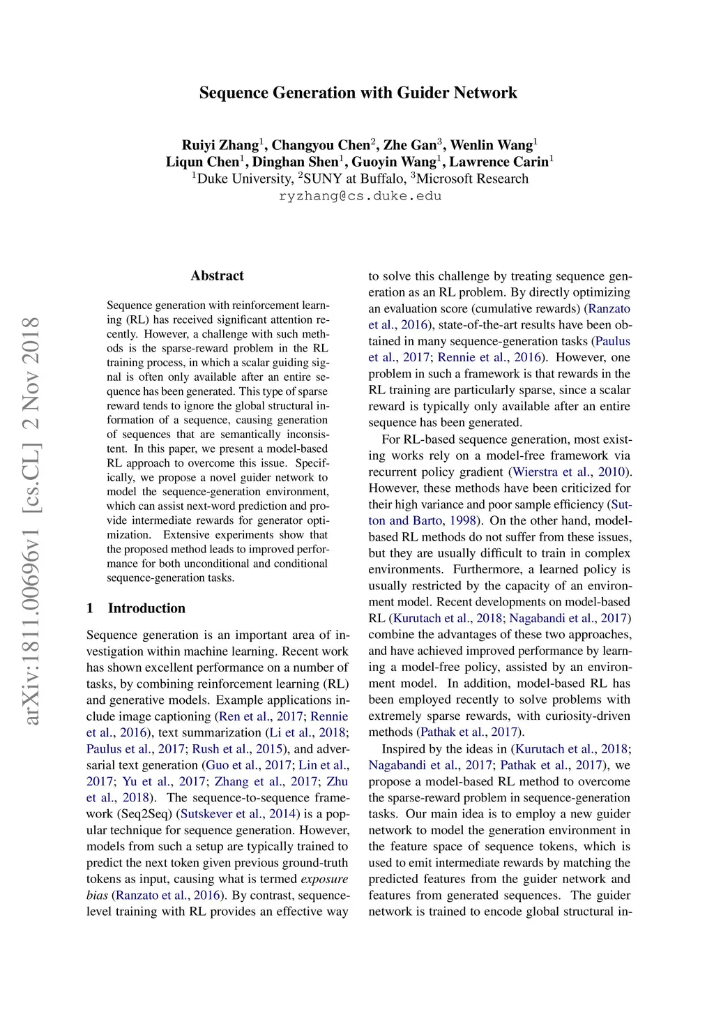 Sequence generation with reinforcement learning (RL) has received significant attention recently. However, a challenge with such methods is the sparse-reward problem in the RL training process, in which a scalar guiding signal is often only available after an entire sequence has been generated. This type of sparse reward tends to ignore the global structural information of a sequence, causing generation of sequences that are semantically inconsistent. In this paper, we present a model-based RL approach to overcome this issue. Specifically, we propose a novel guider network to model the sequence-generation environment, which can assist next-word prediction and provide intermediate rewards for generator optimization. Extensive experiments show that the proposed method leads to improved performance for both unconditional and conditional sequence-generation tasks.