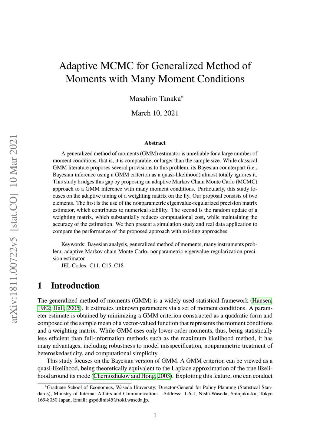 A generalized method of moments (GMM) estimator is unreliable for a large number of moment conditions, that is, it is comparable, or larger than the sample size. While classical GMM literature proposes several provisions to this problem, its Bayesian counterpart (i.e., Bayesian inference using a GMM criterion as a quasi-likelihood) almost totally ignores it. This study bridges this gap by proposing an adaptive Markov Chain Monte Carlo (MCMC) approach to a GMM inference with many moment conditions. Particularly, this study focuses on the adaptive tuning of a weighting matrix on the fly. Our proposal consists of two elements. The first is the use of the nonparametric eigenvalue-regularized precision matrix estimator, which contributes to numerical stability. The second is the random update of a weighting matrix, which substantially reduces computational cost, while maintaining the accuracy of the estimation. We then present a simulation study and real data application to compare the performance of the proposed approach with existing approaches.