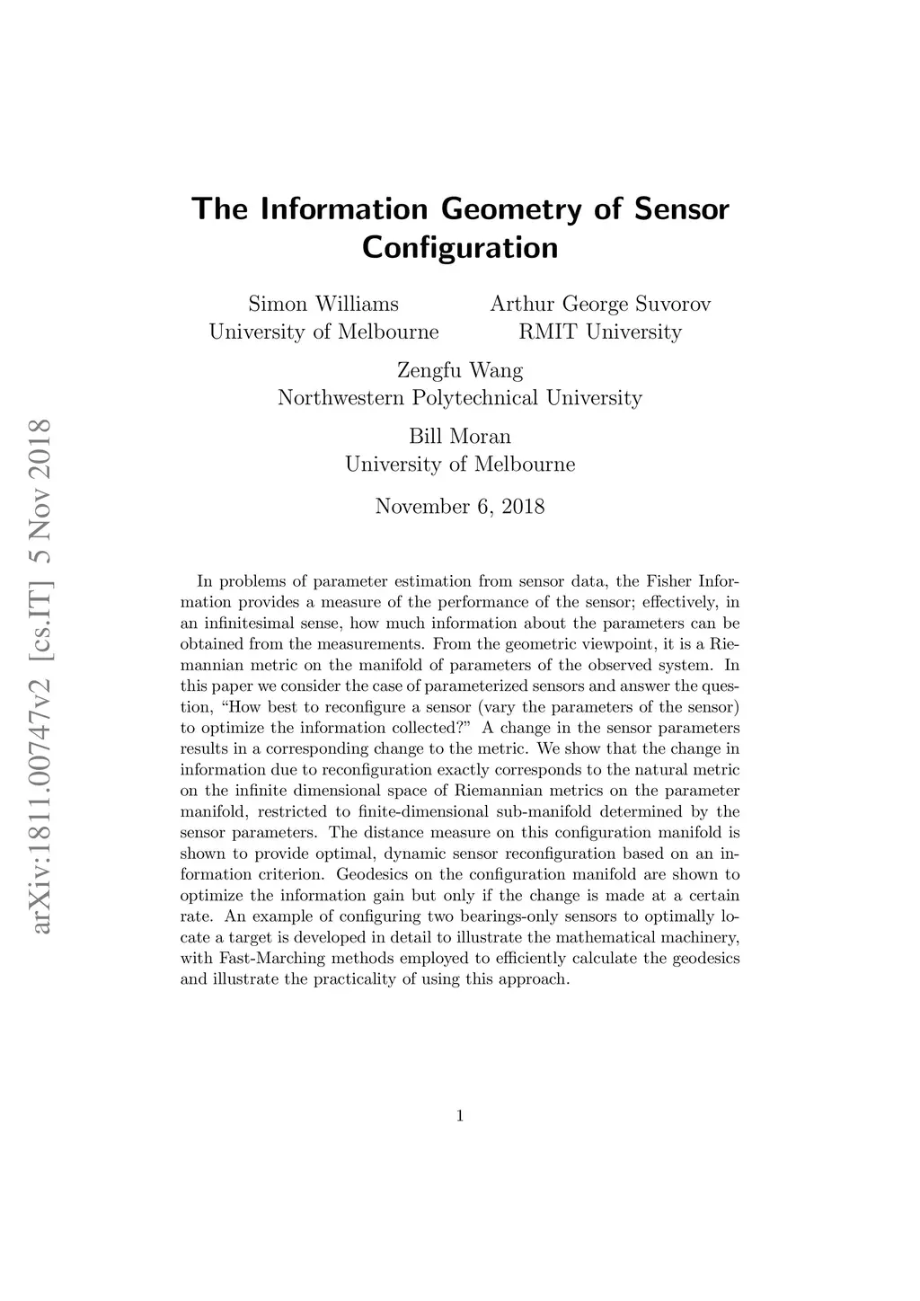In problems of parameter estimation from sensor data, the Fisher Information provides a measure of the performance of the sensor; effectively, in an infinitesimal sense, how much information about the parameters can be obtained from the measurements. From the geometric viewpoint, it is a Riemannian metric on the manifold of parameters of the observed system. In this paper we consider the case of parameterized sensors and answer the question, "How best to reconfigure a sensor (vary the parameters of the sensor) to optimize the information collected?" A change in the sensor parameters results in a corresponding change to the metric. We show that the change in information due to reconfiguration exactly corresponds to the natural metric on the infinite dimensional space of Riemannian metrics on the parameter manifold, restricted to finite-dimensional sub-manifold determined by the sensor parameters. The distance measure on this configuration manifold is shown to provide optimal, dynamic sensor reconfiguration based on an information criterion. Geodesics on the configuration manifold are shown to optimize the information gain but only if the change is made at a certain rate. An example of configuring two bearings-only sensors to optimally locate a target is developed in detail to illustrate the mathematical machinery, with Fast-Marching methods employed to efficiently calculate the geodesics and illustrate the practicality of using this approach.
