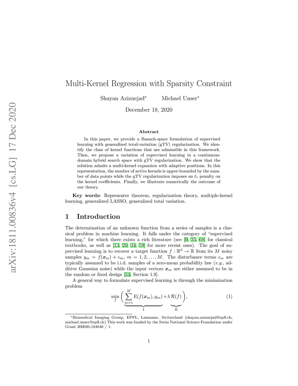 In this paper, we provide a Banach-space formulation of supervised learning with generalized total-variation (gTV) regularization. We identify the class of kernel functions that are admissible in this framework. Then, we propose a variation of supervised learning in a continuous-domain hybrid search space with gTV regularization. We show that the solution admits a multi-kernel expansion with adaptive positions. In this representation, the number of active kernels is upper-bounded by the number of data points while the gTV regularization imposes an penalty on the kernel coefficients. Finally, we illustrate numerically the outcome of our theory.