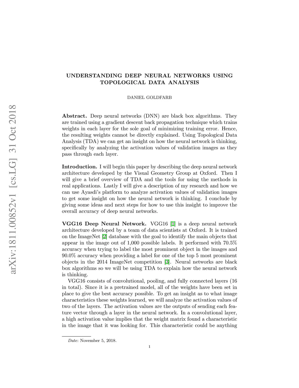 Deep neural networks (DNN) are black box algorithms. They are trained using a gradient descent back propagation technique which trains weights in each layer for the sole goal of minimizing training error. Hence, the resulting weights cannot be directly explained. Using Topological Data Analysis (TDA) we can get an insight on how the neural network is thinking, specifically by analyzing the activation values of validation images as they pass through each layer.