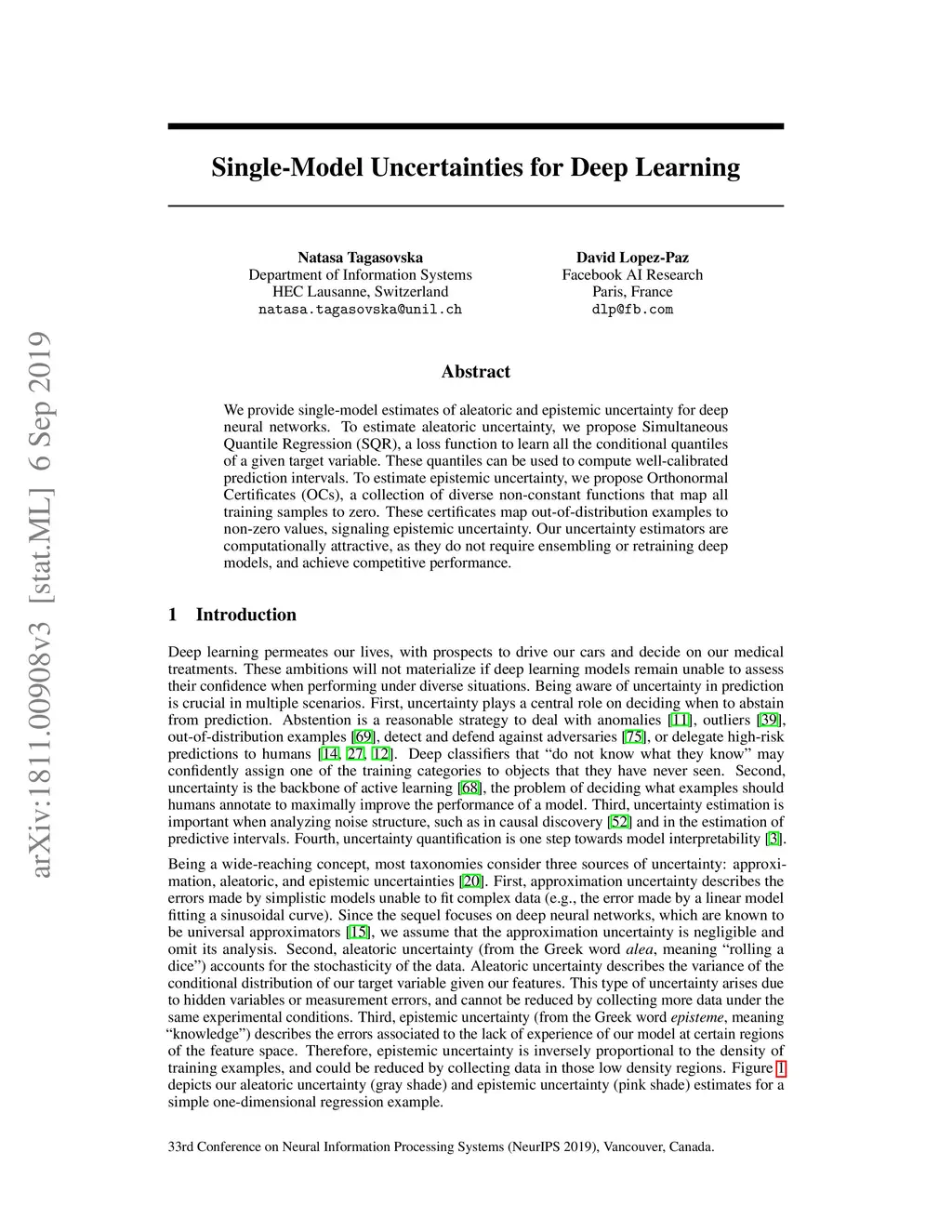 We provide single-model estimates of aleatoric and epistemic uncertainty for deep neural networks. To estimate aleatoric uncertainty, we propose Simultaneous Quantile Regression (SQR), a loss function to learn all the conditional quantiles of a given target variable. These quantiles can be used to compute well-calibrated prediction intervals. To estimate epistemic uncertainty, we propose Orthonormal Certificates (OCs), a collection of diverse non-constant functions that map all training samples to zero. These certificates map out-of-distribution examples to non-zero values, signaling epistemic uncertainty. Our uncertainty estimators are computationally attractive, as they do not require ensembling or retraining deep models, and achieve competitive performance.
