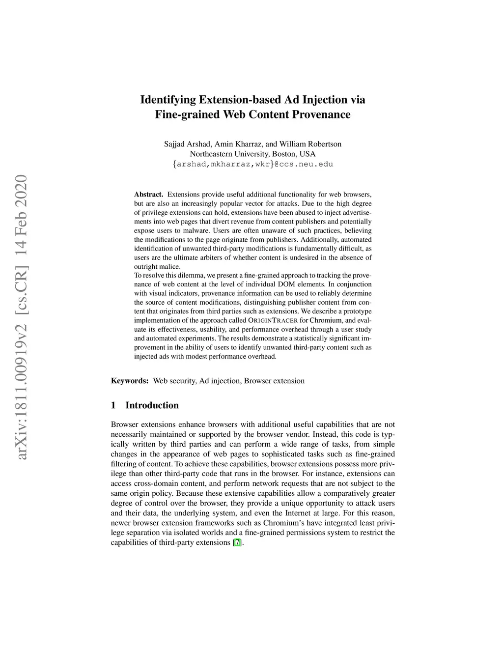 Extensions provide useful additional functionality for web browsers, but are also an increasingly popular vector for attacks. Due to the high degree of privilege extensions can hold, extensions have been abused to inject advertisements into web pages that divert revenue from content publishers and potentially expose users to malware. Users are often unaware of such practices, believing the modifications to the page originate from publishers. Additionally, automated identification of unwanted third-party modifications is fundamentally difficult, as users are the ultimate arbiters of whether content is undesired in the absence of outright malice. To resolve this dilemma, we present a fine-grained approach to tracking the provenance of web content at the level of individual DOM elements. In conjunction with visual indicators, provenance information can be used to reliably determine the source of content modifications, distinguishing publisher content from content that originates from third parties such as extensions. We describe a prototype implementation of the approach called OriginTracer for Chromium, and evaluate its effectiveness, usability, and performance overhead through a user study and automated experiments. The results demonstrate a statistically significant improvement in the ability of users to identify unwanted third-party content such as injected ads with modest performance overhead.