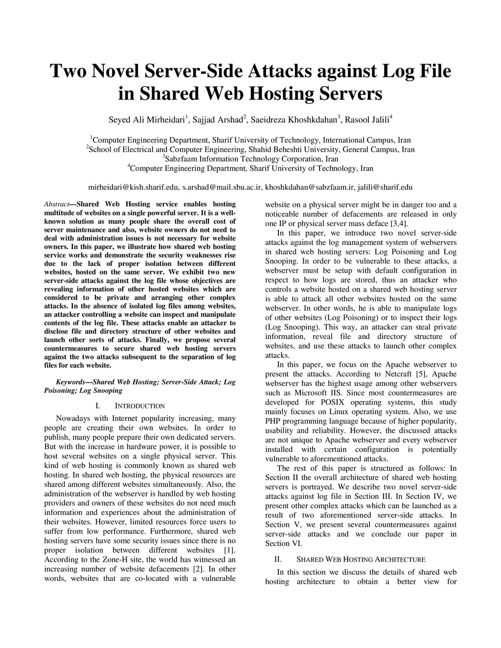 Two Novel Server-Side Attacks against Log File in Shared Web Hosting
