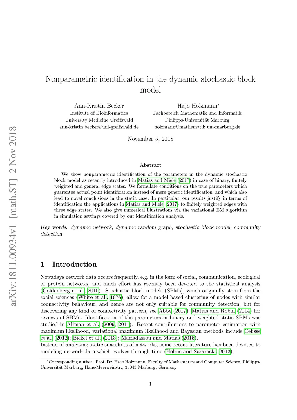We show nonparametric identification of the parameters in the dynamic stochastic block model as recently introduced in Matias and Miele (2017) in case of binary, finitely weighted and general edge states. We formulate conditions on the true parameters which guarantee actual point identification instead of mere generic identification, and which also lead to novel conclusions in the static case. In particular, our results justify in terms of identification the applications in Matias and Miele (2017) to finitely weighted edges with three edge states. We also give numerical illustrations via the variational EM algorithm in simulation settings covered by our identification analysis.