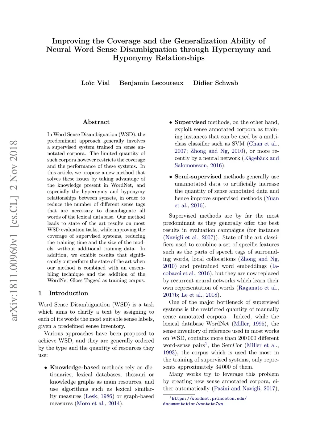 In Word Sense Disambiguation (WSD), the predominant approach generally involves a supervised system trained on sense annotated corpora. The limited quantity of such corpora however restricts the coverage and the performance of these systems. In this article, we propose a new method that solves these issues by taking advantage of the knowledge present in WordNet, and especially the hypernymy and hyponymy relationships between synsets, in order to reduce the number of different sense tags that are necessary to disambiguate all words of the lexical database. Our method leads to state of the art results on most WSD evaluation tasks, while improving the coverage of supervised systems, reducing the training time and the size of the models, without additional training data. In addition, we exhibit results that significantly outperform the state of the art when our method is combined with an ensembling technique and the addition of the WordNet Gloss Tagged as training corpus.