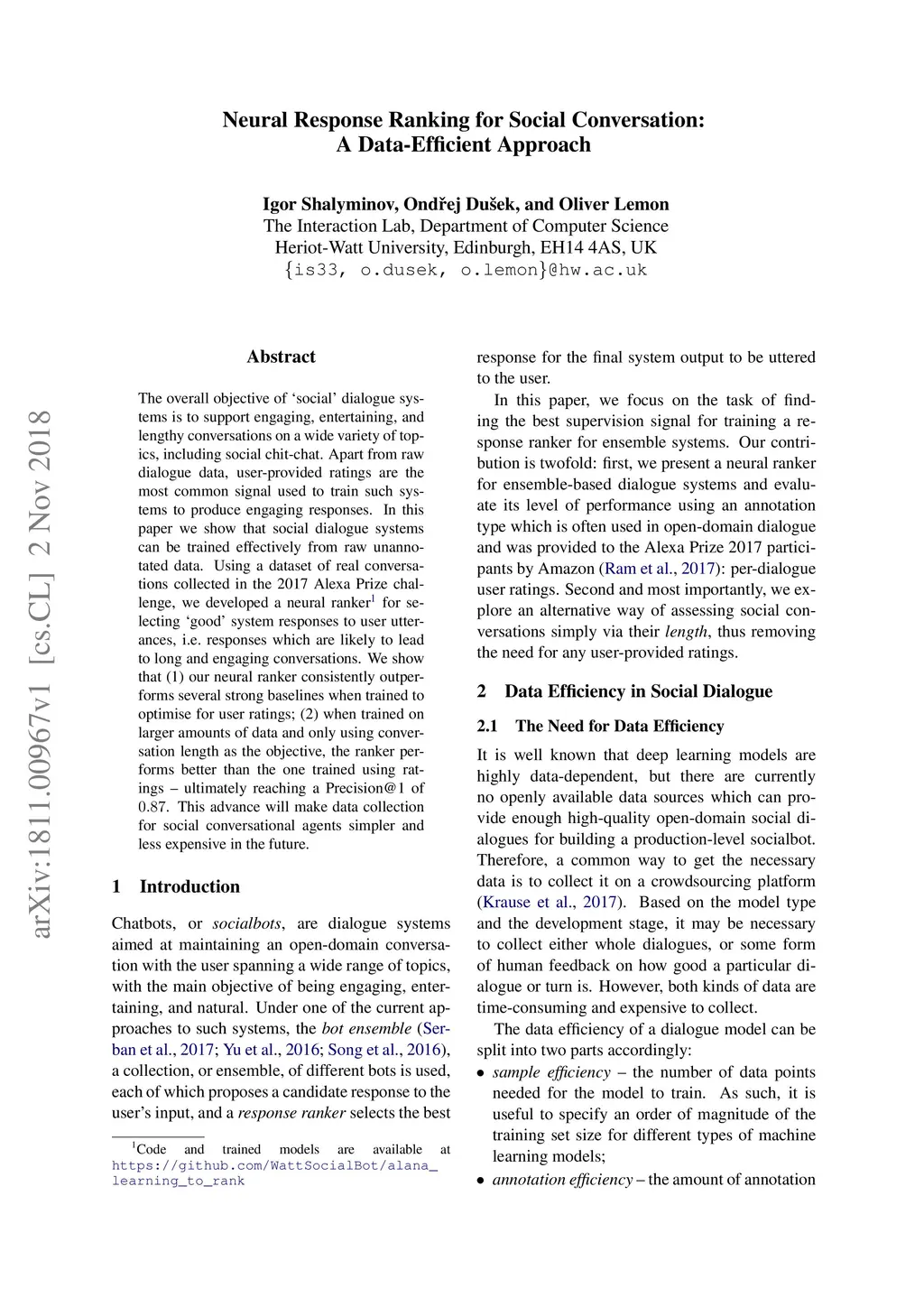 Neural Response Ranking for Social Conversation: A Data-Efficient