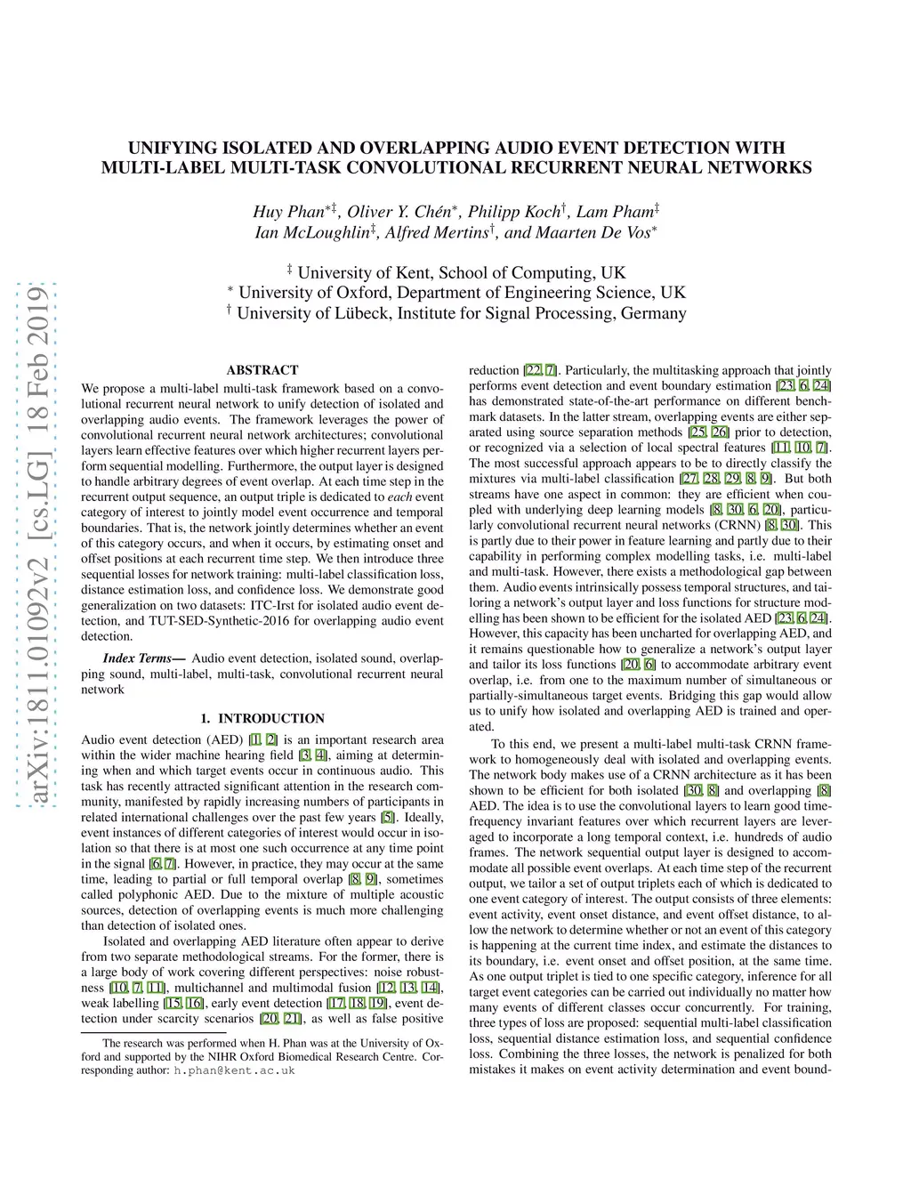 We propose a multi-label multi-task framework based on a convolutional recurrent neural network to unify detection of isolated and overlapping audio events. The framework leverages the power of convolutional recurrent neural network architectures; convolutional layers learn effective features over which higher recurrent layers perform sequential modelling. Furthermore, the output layer is designed to handle arbitrary degrees of event overlap. At each time step in the recurrent output sequence, an output triple is dedicated to each event category of interest to jointly model event occurrence and temporal boundaries. That is, the network jointly determines whether an event of this category occurs, and when it occurs, by estimating onset and offset positions at each recurrent time step. We then introduce three sequential losses for network training: multi-label classification loss, distance estimation loss, and confidence loss. We demonstrate good generalization on two datasets: ITC-Irst for isolated audio event detection, and TUT-SED-Synthetic-2016 for overlapping audio event detection.
