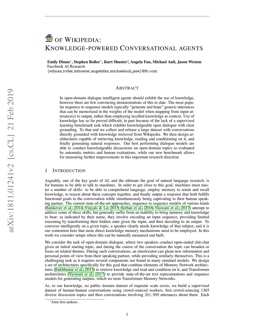 In open-domain dialogue intelligent agents should exhibit the use of knowledge, however there are few convincing demonstrations of this to date. The most popular sequence to sequence models typically "generate and hope" generic utterances that can be memorized in the weights of the model when mapping from input utterance(s) to output, rather than employing recalled knowledge as context. Use of knowledge has so far proved difficult, in part because of the lack of a supervised learning benchmark task which exhibits knowledgeable open dialogue with clear grounding. To that end we collect and release a large dataset with conversations directly grounded with knowledge retrieved from Wikipedia. We then design architectures capable of retrieving knowledge, reading and conditioning on it, and finally generating natural responses. Our best performing dialogue models are able to conduct knowledgeable discussions on open-domain topics as evaluated by automatic metrics and human evaluations, while our new benchmark allows for measuring further improvements in this important research direction.