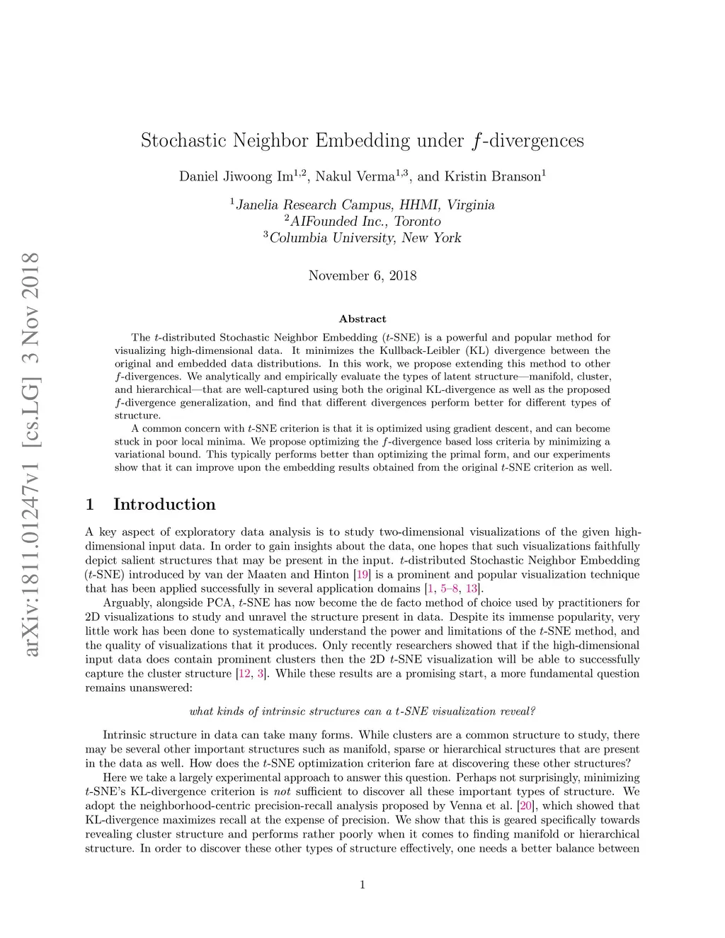 The t-distributed Stochastic Neighbor Embedding (t-SNE) is a powerful and popular method for visualizing high-dimensional data. It minimizes the Kullback-Leibler (KL) divergence between the original and embedded data distributions. In this work, we propose extending this method to other f-divergences. We analytically and empirically evaluate the types of latent structure-manifold, cluster, and hierarchical-that are well-captured using both the original KL-divergence as well as the proposed f-divergence generalization, and find that different divergences perform better for different types of structure. A common concern with -SNE criterion is that it is optimized using gradient descent, and can become stuck in poor local minima. We propose optimizing the f-divergence based loss criteria by minimizing a variational bound. This typically performs better than optimizing the primal form, and our experiments show that it can improve upon the embedding results obtained from the original -SNE criterion as well.