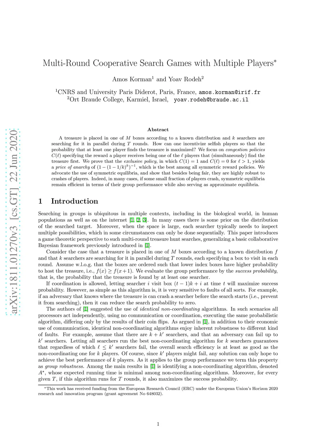 Assume that a treasure is placed in one of boxes according to a known distribution and that searchers are searching for it in parallel during rounds. We study the question of how to incentivize selfish players so that the success probability, namely, the probability that at least one player finds the treasure, would be maximized. We focus on congestion policies that specify the reward that a player receives if it is one of players that (simultaneously) find the treasure for the first time. Our main technical contribution is proving that the exclusive policy, in which and for , yields a price of anarchy of , and that this is the best possible price among all symmetric reward mechanisms. For this policy we also have an explicit description of a symmetric equilibrium, which is in some sense unique, and moreover enjoys the best success probability among all symmetric profiles. For general congestion policies, we show how to polynomially find, for any , a symmetric multiplicative -equilibrium. Together with an appropriate reward policy, a central entity can suggest players to play a particular profile at equilibrium. As our main conceptual contribution, we advocate the use of symmetric equilibria for such purposes. Besides being fair, we argue that in many cases, despite the fact that some small fraction of players crash, symmetric equilibria remain efficient in terms of their group performances and, at the same time, serve as approximate equilibria. We show that this principle holds for a class of games, which we call monotonously scalable games. This applies in particular to our search game, assuming the sharing policy, in which . For the exclusive policy, this general result does not hold, but we show that the symmetric equilibrium is nevertheless robust under mild assumptions.