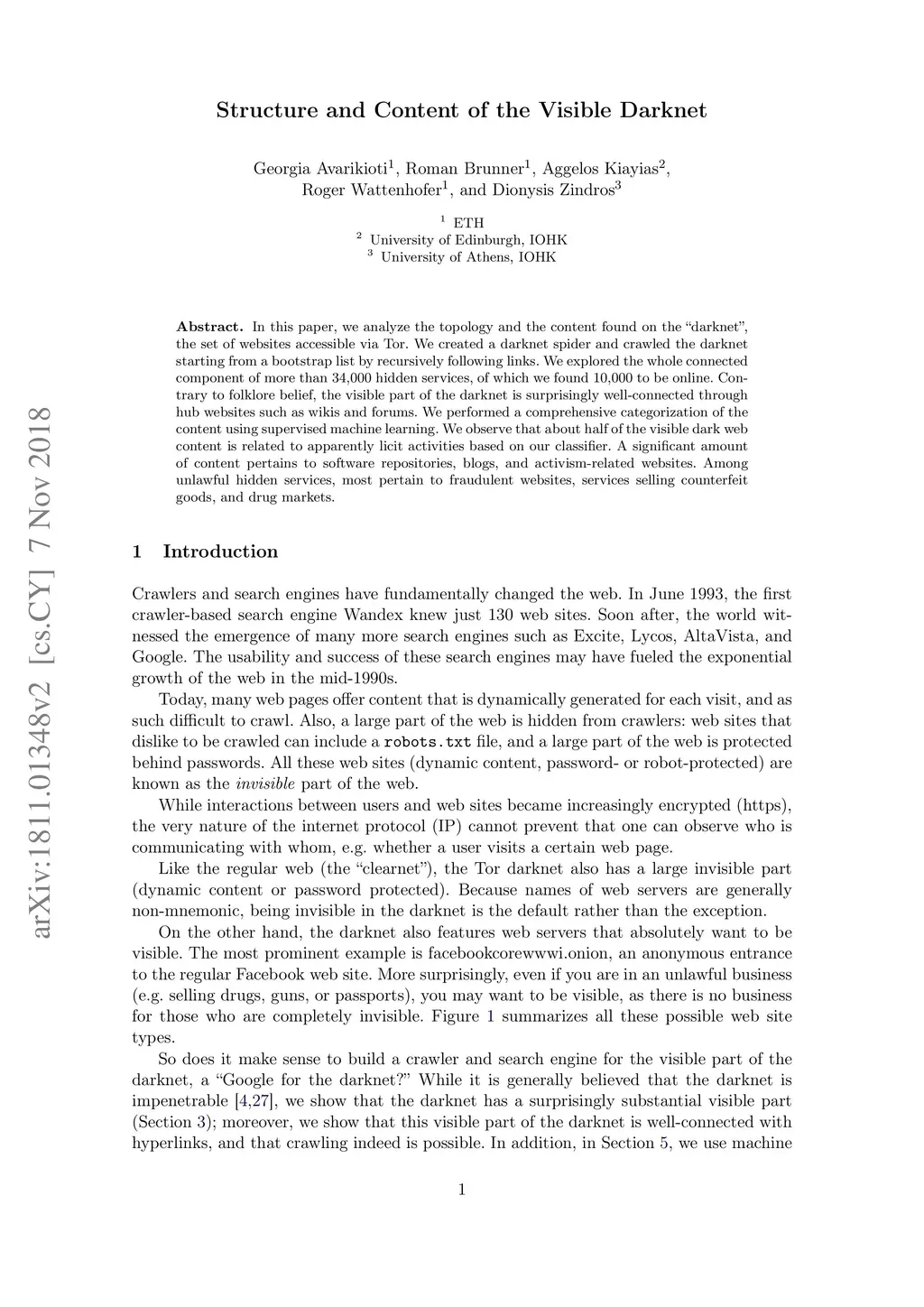 In this paper, we analyze the topology and the content found on the "darknet", the set of websites accessible via Tor. We created a darknet spider and crawled the darknet starting from a bootstrap list by recursively following links. We explored the whole connected component of more than 34,000 hidden services, of which we found 10,000 to be online. Contrary to folklore belief, the visible part of the darknet is surprisingly well-connected through hub websites such as wikis and forums. We performed a comprehensive categorization of the content using supervised machine learning. We observe that about half of the visible dark web content is related to apparently licit activities based on our classifier. A significant amount of content pertains to software repositories, blogs, and activism-related websites. Among unlawful hidden services, most pertain to fraudulent websites, services selling counterfeit goods, and drug markets.