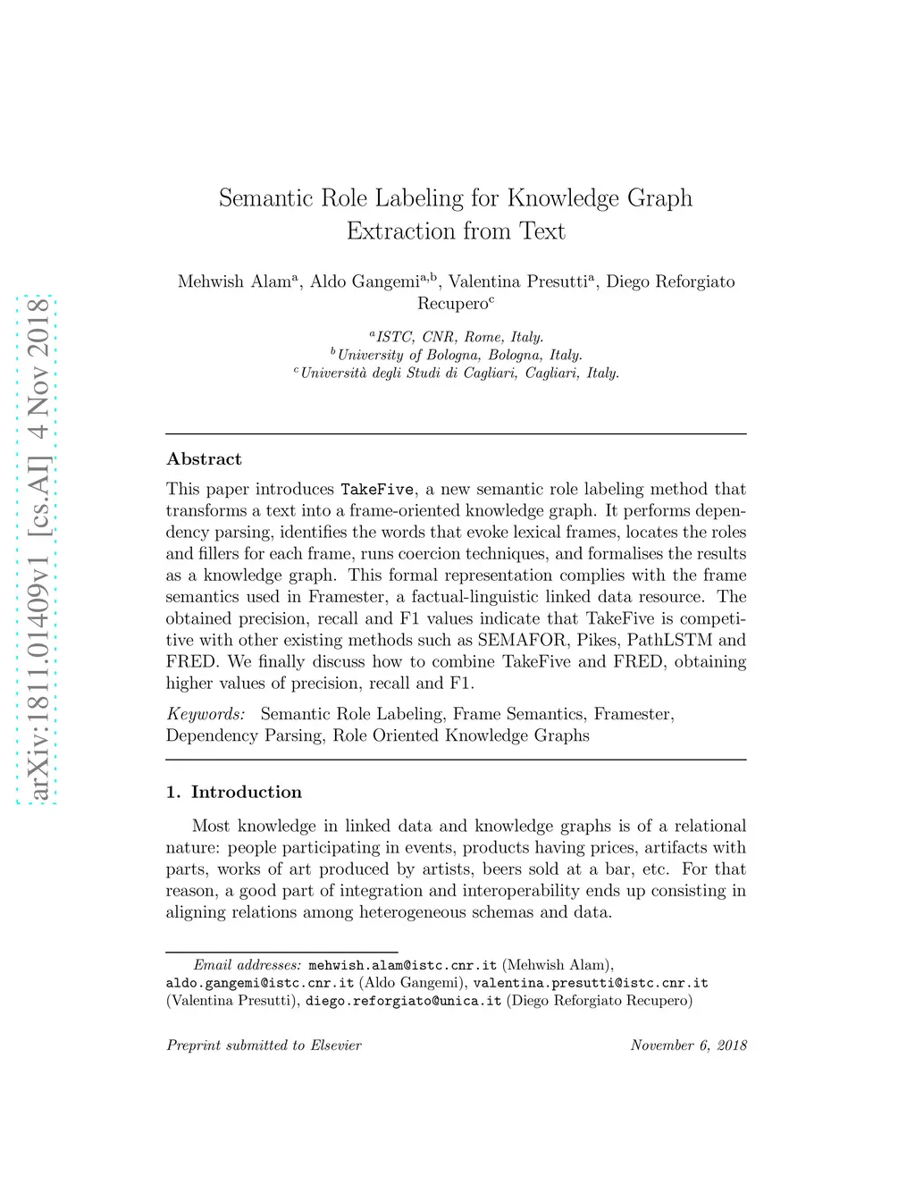 This paper introduces TakeFive, a new semantic role labeling method that transforms a text into a frame-oriented knowledge graph. It performs dependency parsing, identifies the words that evoke lexical frames, locates the roles and fillers for each frame, runs coercion techniques, and formalises the results as a knowledge graph. This formal representation complies with the frame semantics used in Framester, a factual-linguistic linked data resource. The obtained precision, recall and F1 values indicate that TakeFive is competitive with other existing methods such as SEMAFOR, Pikes, PathLSTM and FRED. We finally discuss how to combine TakeFive and FRED, obtaining higher values of precision, recall and F1.