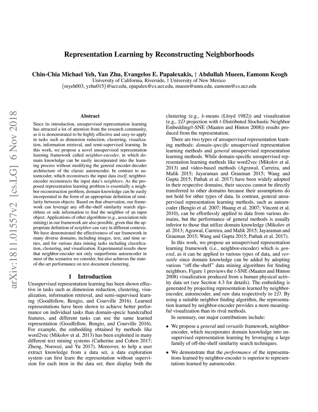 Since its introduction, unsupervised representation learning has attracted a lot of attention from the research community, as it is demonstrated to be highly effective and easy-to-apply in tasks such as dimension reduction, clustering, visualization, information retrieval, and semi-supervised learning. In this work, we propose a novel unsupervised representation learning framework called neighbor-encoder, in which domain knowledge can be easily incorporated into the learning process without modifying the general encoder-decoder architecture of the classic autoencoder.In contrast to autoencoder, which reconstructs the input data itself, neighbor-encoder reconstructs the input data's neighbors. As the proposed representation learning problem is essentially a neighbor reconstruction problem, domain knowledge can be easily incorporated in the form of an appropriate definition of similarity between objects. Based on that observation, our framework can leverage any off-the-shelf similarity search algorithms or side information to find the neighbor of an input object. Applications of other algorithms (e.g., association rule mining) in our framework are also possible, given that the appropriate definition of neighbor can vary in different contexts. We have demonstrated the effectiveness of our framework in many diverse domains, including images, text, and time series, and for various data mining tasks including classification, clustering, and visualization. Experimental results show that neighbor-encoder not only outperforms autoencoder in most of the scenarios we consider, but also achieves the state-of-the-art performance on text document clustering.