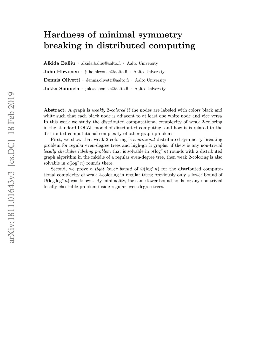 A graph is weakly -colored if the nodes are labeled with colors black and white such that each black node is adjacent to at least one white node and vice versa. In this work we study the distributed computational complexity of weak -coloring in the standard LOCAL model of distributed computing, and how it is related to the distributed computational complexity of other graph problems. First, we show that weak -coloring is a minimal distributed symmetry-breaking problem for regular even-degree trees and high-girth graphs: if there is any non-trivial locally checkable labeling problem that is solvable in rounds with a distributed graph algorithm in the middle of a regular even-degree tree, then weak -coloring is also solvable in rounds there. Second, we prove a tight lower bound of for the distributed computational complexity of weak -coloring in regular trees; previously only a lower bound of was known. By minimality, the same lower bound holds for any non-trivial locally checkable problem inside regular even-degree trees.