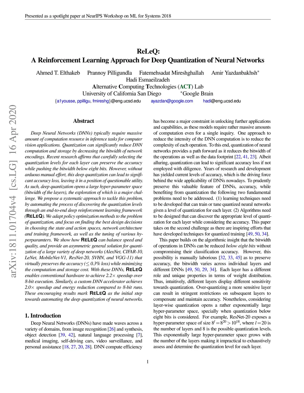 ReLeQ: A Reinforcement Learning Approach for Deep Quantization of Neural