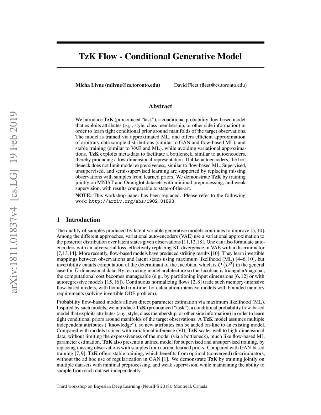 We introduce TzK (pronounced "task"), a conditional probability flow-based model that exploits attributes (e.g., style, class membership, or other side information) in order to learn tight conditional prior around manifolds of the target observations. The model is trained via approximated ML, and offers efficient approximation of arbitrary data sample distributions (similar to GAN and flow-based ML), and stable training (similar to VAE and ML), while avoiding variational approximations. TzK exploits meta-data to facilitate a bottleneck, similar to autoencoders, thereby producing a low-dimensional representation. Unlike autoencoders, the bottleneck does not limit model expressiveness, similar to flow-based ML. Supervised, unsupervised, and semi-supervised learning are supported by replacing missing observations with samples from learned priors. We demonstrate TzK by training jointly on MNIST and Omniglot datasets with minimal preprocessing, and weak supervision, with results comparable to state-of-the-art.
