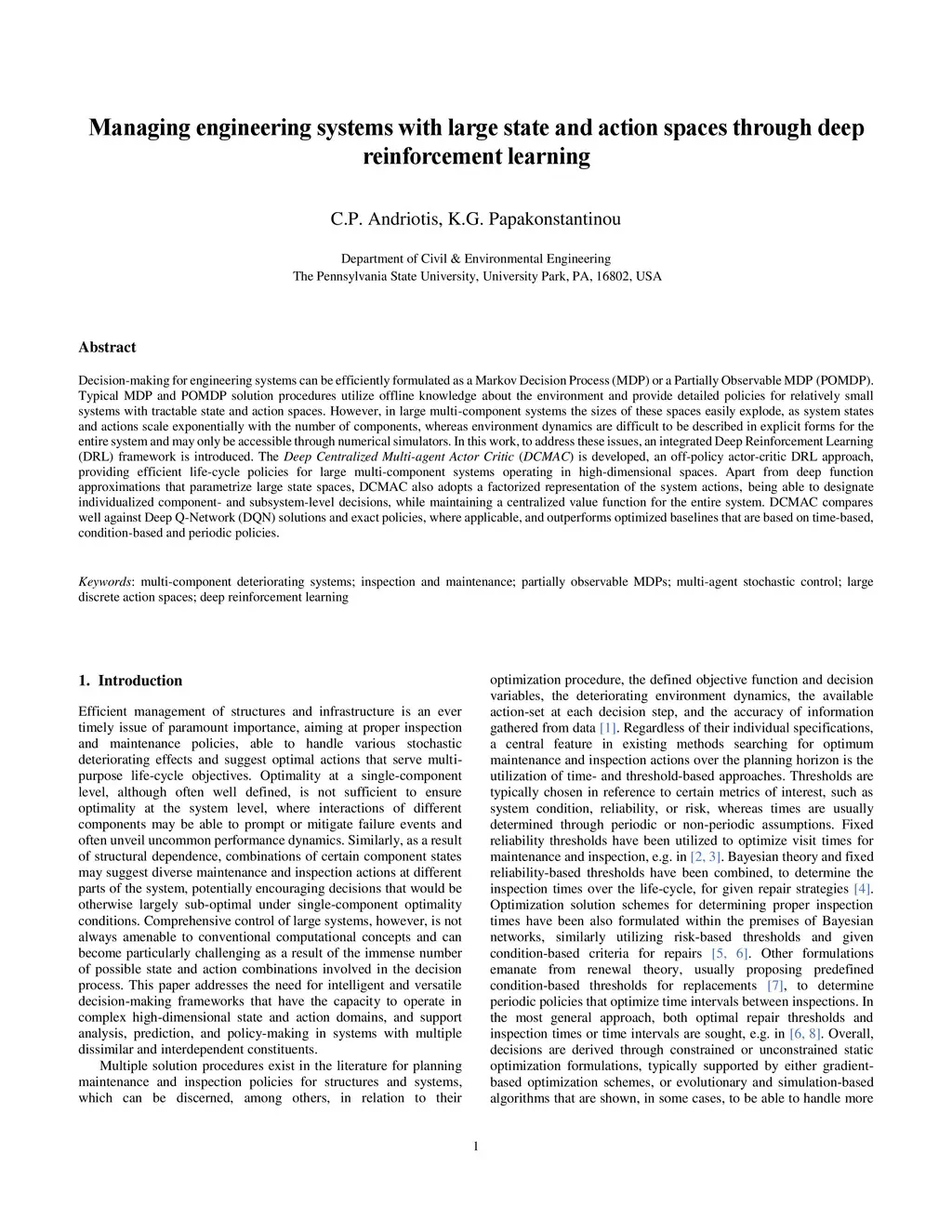 Decision-making for engineering systems can be efficiently formulated as a Markov Decision Process (MDP) or a Partially Observable MDP (POMDP). Typical MDP and POMDP solution procedures utilize offline knowledge about the environment and provide detailed policies for relatively small systems with tractable state and action spaces. However, in large multi-component systems the sizes of these spaces easily explode, as system states and actions scale exponentially with the number of components, whereas environment dynamics are difficult to be described in explicit forms for the entire system and may only be accessible through numerical simulators. In this work, to address these issues, an integrated Deep Reinforcement Learning (DRL) framework is introduced. The Deep Centralized Multi-agent Actor Critic (DCMAC) is developed, an off-policy actor-critic DRL approach, providing efficient life-cycle policies for large multi-component systems operating in high-dimensional spaces. Apart from deep function approximations that parametrize large state spaces, DCMAC also adopts a factorized representation of the system actions, being able to designate individualized component- and subsystem-level decisions, while maintaining a centralized value function for the entire system. DCMAC compares well against Deep Q-Network (DQN) solutions and exact policies, where applicable, and outperforms optimized baselines that are based on time-based, condition-based and periodic policies.