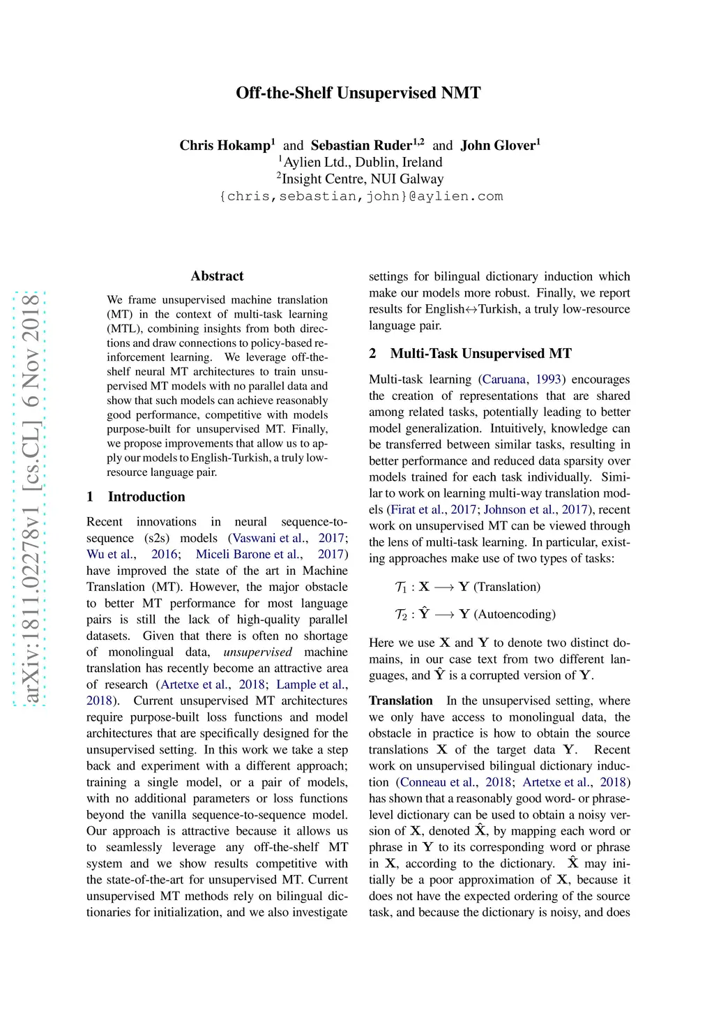We frame unsupervised machine translation (MT) in the context of multi-task learning (MTL), combining insights from both directions. We leverage off-the-shelf neural MT architectures to train unsupervised MT models with no parallel data and show that such models can achieve reasonably good performance, competitive with models purpose-built for unsupervised MT. Finally, we propose improvements that allow us to apply our models to English-Turkish, a truly low-resource language pair.