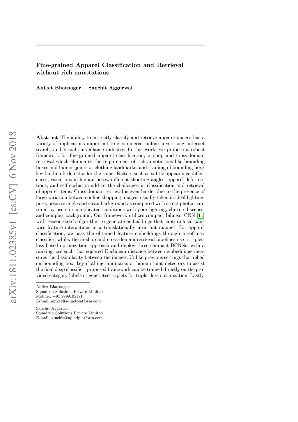 The ability to correctly classify and retrieve apparel images has a variety of applications important to e-commerce, online advertising and internet search. In this work, we propose a robust framework for fine-grained apparel classification, in-shop and cross-domain retrieval which eliminates the requirement of rich annotations like bounding boxes and human-joints or clothing landmarks, and training of bounding box/ key-landmark detector for the same. Factors such as subtle appearance differences, variations in human poses, different shooting angles, apparel deformations, and self-occlusion add to the challenges in classification and retrieval of apparel items. Cross-domain retrieval is even harder due to the presence of large variation between online shopping images, usually taken in ideal lighting, pose, positive angle and clean background as compared with street photos captured by users in complicated conditions with poor lighting and cluttered scenes. Our framework uses compact bilinear CNN with tensor sketch algorithm to generate embeddings that capture local pairwise feature interactions in a translationally invariant manner. For apparel classification, we pass the feature embeddings through a softmax classifier, while, the in-shop and cross-domain retrieval pipelines use a triplet-loss based optimization approach, such that squared Euclidean distance between embeddings measures the dissimilarity between the images. Unlike previous works that relied on bounding box, key clothing landmarks or human joint detectors to assist the final deep classifier, proposed framework can be trained directly on the provided category labels or generated triplets for triplet loss optimization. Lastly, Experimental results on the DeepFashion fine-grained categorization, and in-shop and consumer-to-shop retrieval datasets provide a comparative analysis with previous work performed in the domain.